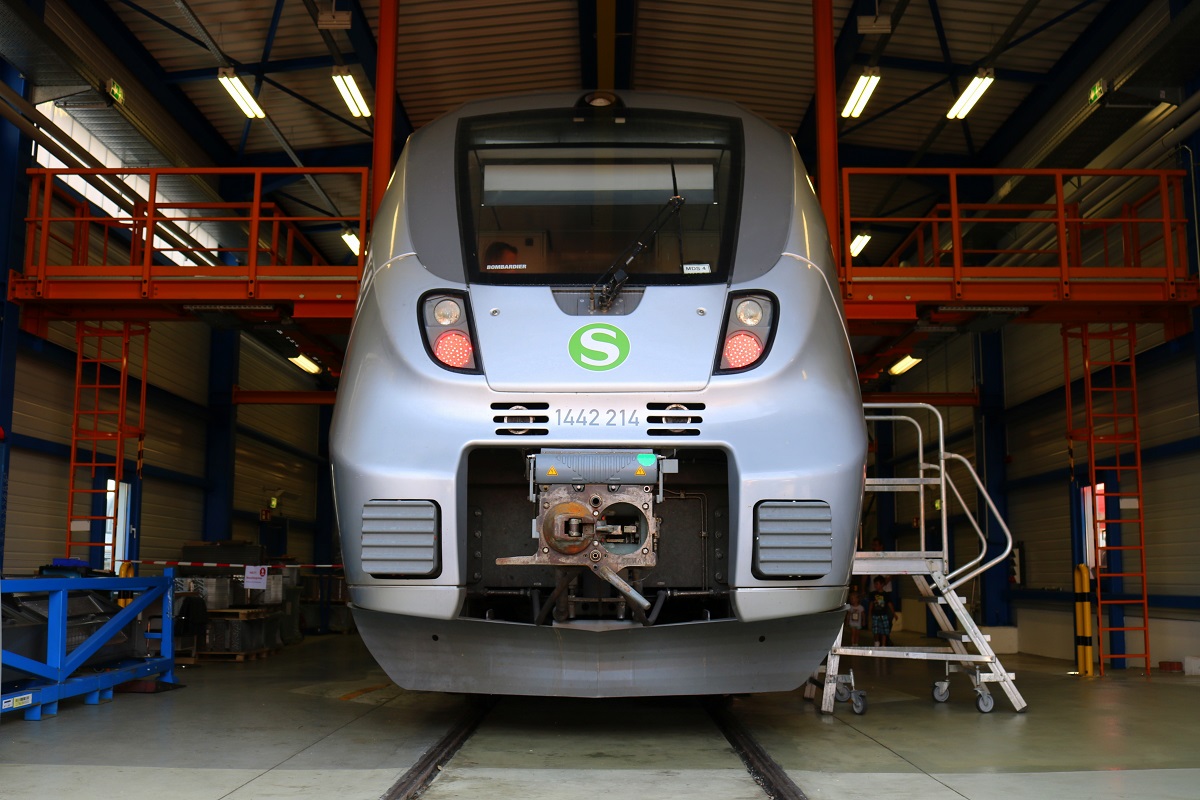 Blick auf den Triebkopf von 1442 214/714 (Bombardier Talent 2) der S-Bahn Mitteldeutschland (DB Regio Südost). Dieser stand in der neuen Werkstatt von DB Regio Südost (Bw Halle) anlässlich des jährlichen Sommerfests des DB Museums Halle (Saale). [26.8.2017 - 15:33 Uhr] Clemens Kral
