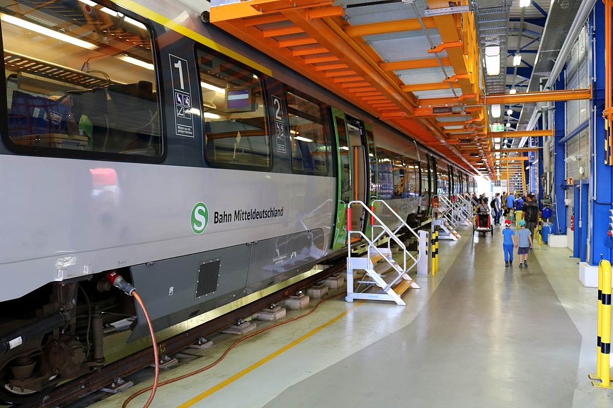 1442 214 (Bombardier Talent 2) der S-Bahn Mitteldeutschland (DB Regio Südost) steht in der neuen Werkstatt von DB Regio Südost (Bw Halle) anlässlich des jährlichen Sommerfests des DB Museums Halle (Saale). Der Innenraum inkl. Führerstand konnte an diesem Wochenende besichtigt werden. [26.8.2017 - 15:38 Uhr] Clemens Kral