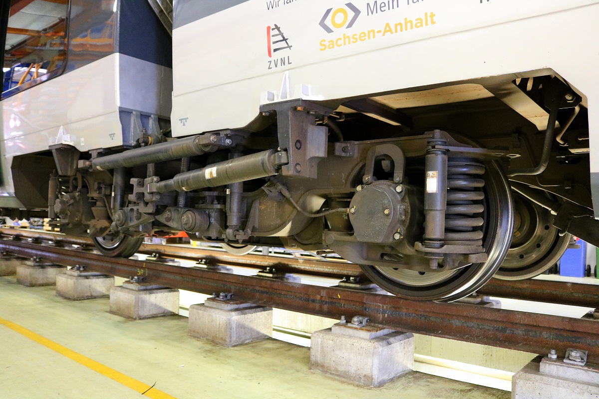 Blick auf ein Jakobsdrehgestell von 1442 214 (Bombardier Talent 2) der S-Bahn Mitteldeutschland (DB Regio Südost). Dieser stand in der neuen Werkstatt von DB Regio Südost (Bw Halle) anlässlich des jährlichen Sommerfests des DB Museums Halle (Saale). Der Drehgestellachsstand beträgt im Bild 2800 mm (2,80 m). [26.8.2017 - 15:34 Uhr] Clemens Kral