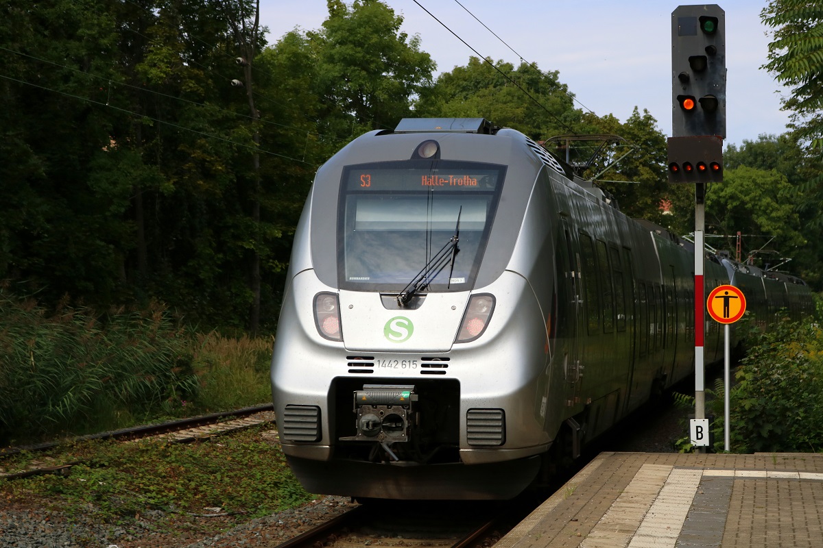 Nachschuss auf 1442 615 und einen weiteren 1442 (Bombardier Talent 2) der S-Bahn Mitteldeutschland (DB Regio Südost) als verspätete S 37334 (S3) von Borna(Leipzig) nach Halle-Trotha, die den Hp Halle Steintorbrücke auf der Bahnstrecke Halle–Vienenburg (KBS 330) verlassen. [26.8.2017 - 14:26 Uhr] Clemens Kral