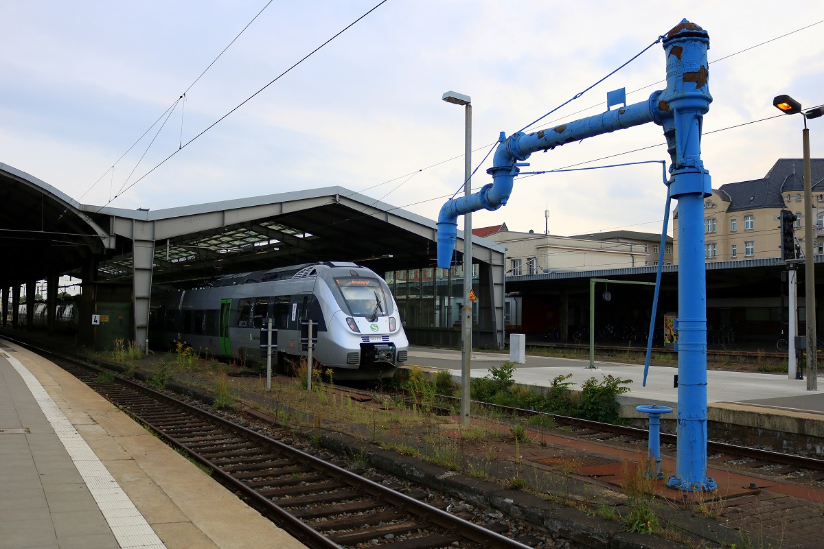 Vor dem lange nicht mehr genutzten Wasserkran haben sich 1442 213 und 1442 610 (Bombardier Talent 2) der S-Bahn Mitteldeutschland als S 37353 (S3) nach Geithain in Halle(Saale)Hbf wiedergefunden. In wenigen Monaten wird dieser inkl. der Überreste der Westseite des Bahnhofs bei den Umbauarbeiten im Rahmen des Verkehrsprojekts Deutsche Einheit Nr. 8 (VDE 8) nicht mehr vorhanden sein. [26.8.2017 - 17:07 Uhr] Clemens Kral