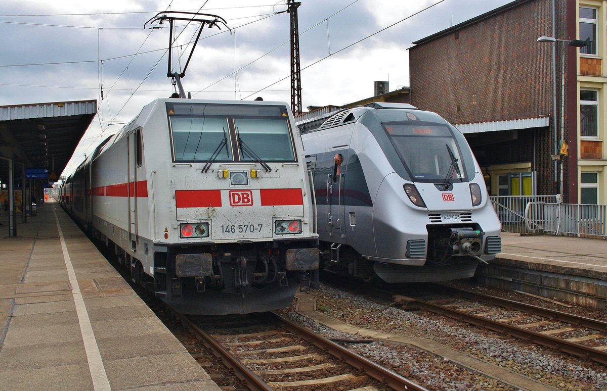 Während 1442 665-4 und 1442 163-0 als RE13 (RE16111) nach Leipzig Hauptbahnhof auf Abfahrt warten, verlässt 146 570-7 mit dem IC2036 von Leipzig Hauptbahnhof nach Norddeich Mole den Magdeburger Hauptbahnhof. (7.4.2017) Alexander