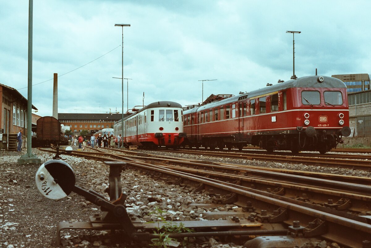 ET 11 01 (DRG) und rechts neben ihm ein Stuttgarter Vorortzug der DB-Baureihe 425 alt auf dem Areal des Containerbahnhofs Stuttgart bei einer Sonderveranstaltung.