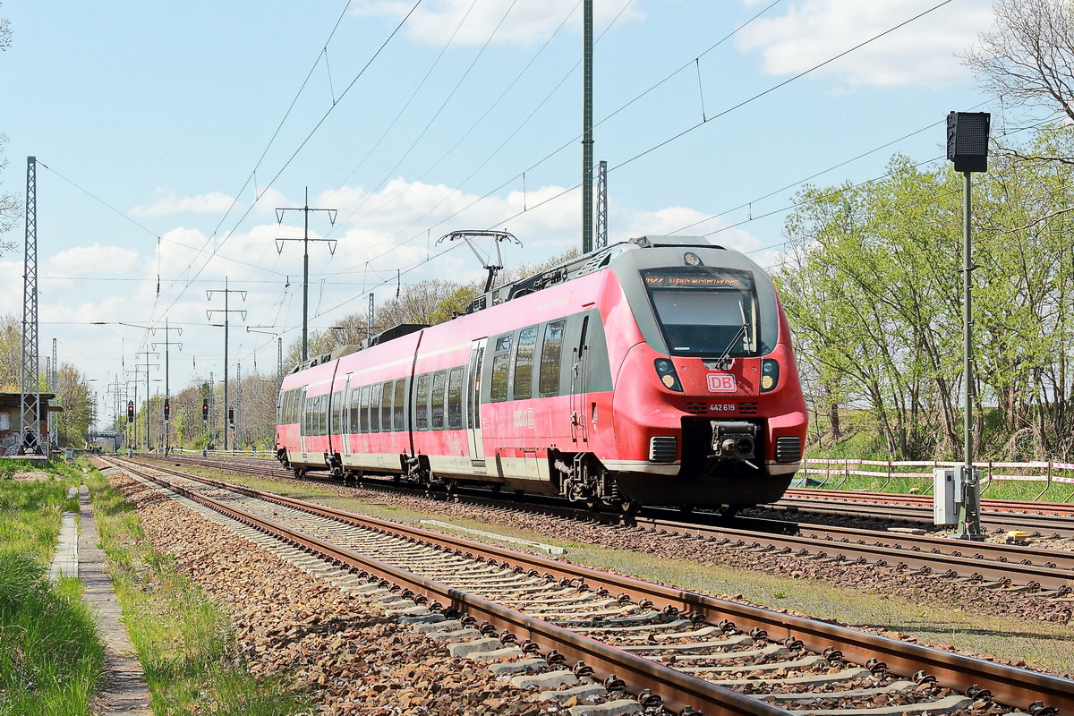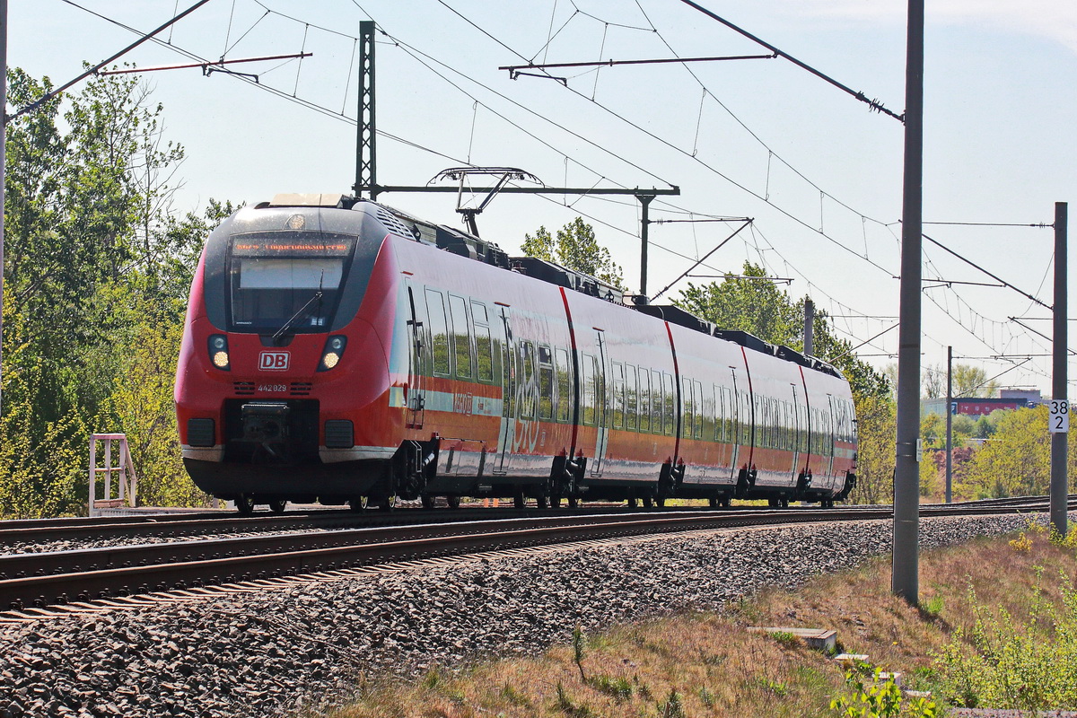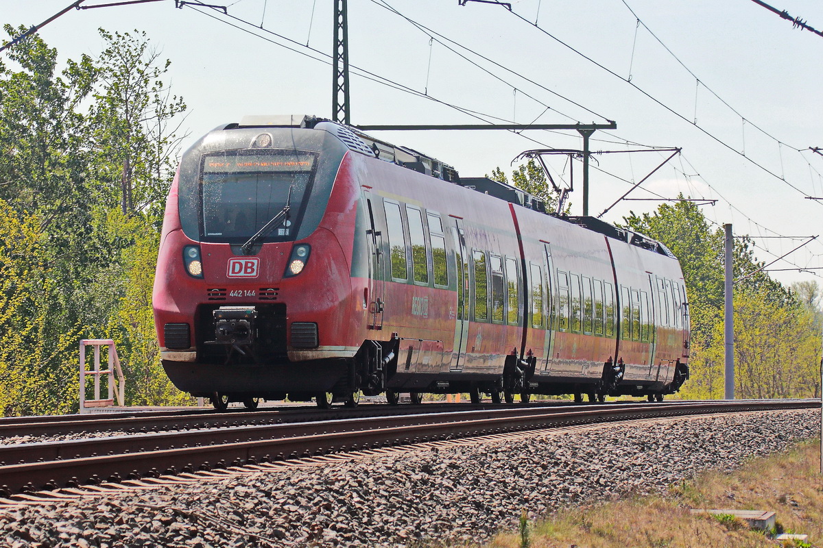 442 144 als RB 22 vom BER Terminal 1-2 nach Königs Wusterhausen am 08. Mai 2022, gesehen in Kienberg, eine zu Waltersdorf gehörende Siedlung in der Gemeinde Schönefeld im Landkreis Dahme-Spreewald in Brandenburg. Klaus-P. Dietrich