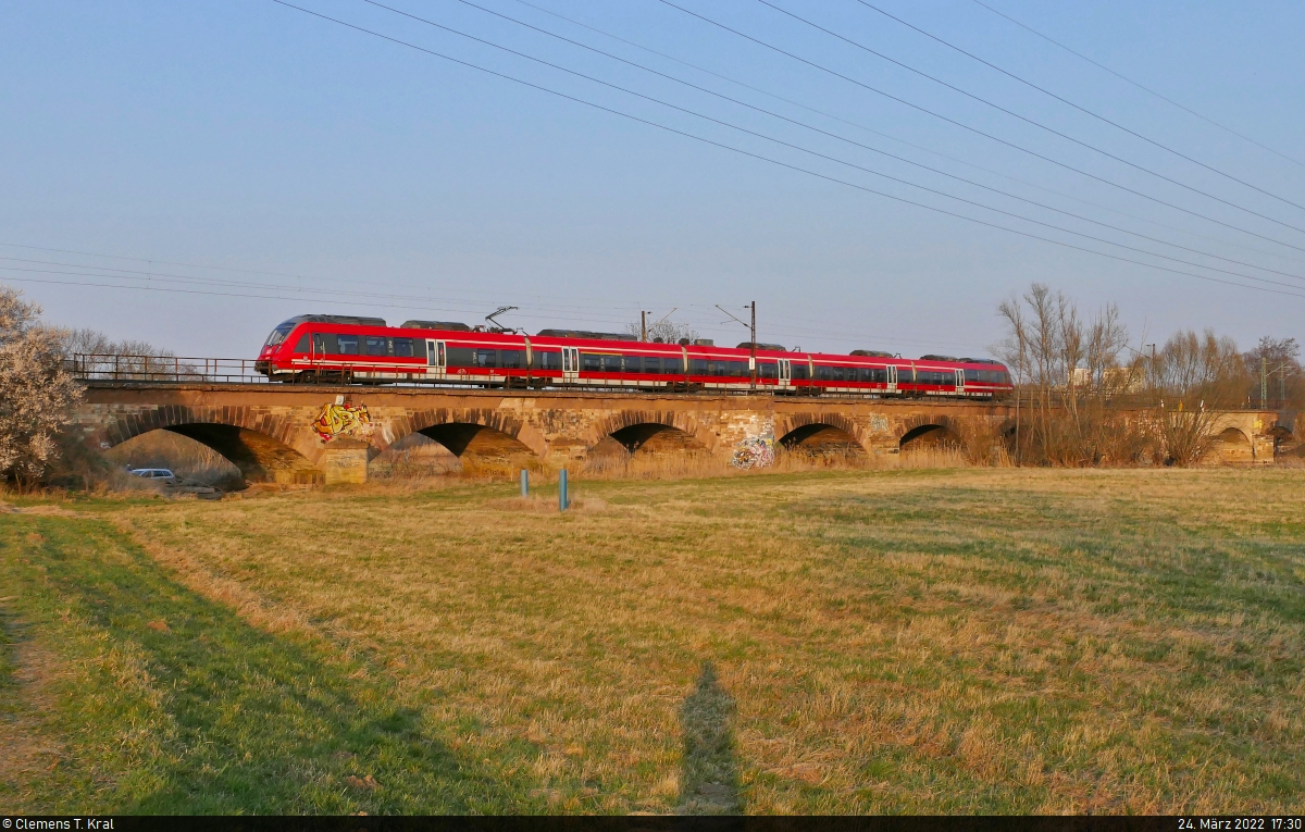 In diesem Nachschuss an der Saalebrücke von Halle-Wörmlitz nimmt der für den "Saxonia-Express" fahrende 442 812 (Bombardier Talent 2) Kurs auf heimatliche Gefilde. Woher er kam, ist mir nicht bekannt.