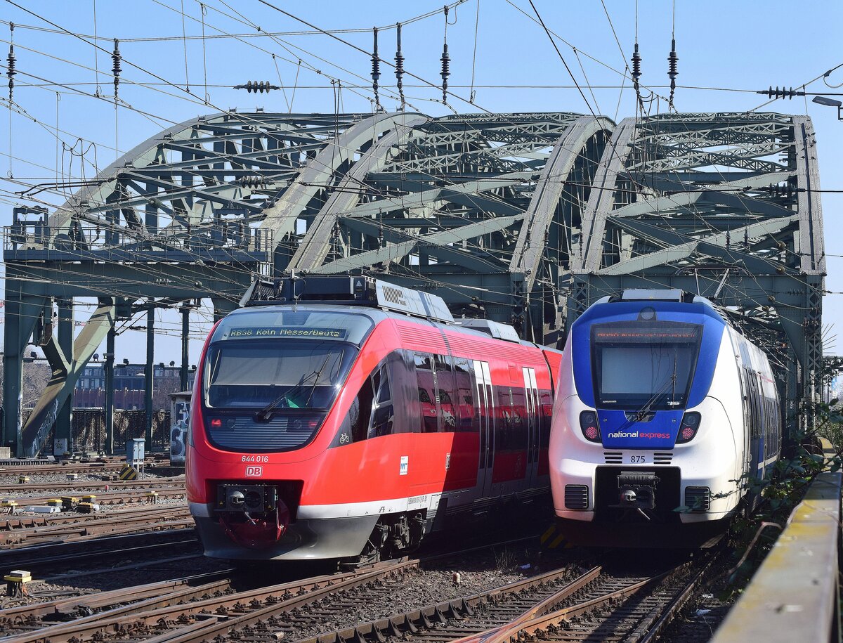 Talent 1 und sein Nachfolger Talent 2. 644 016 und NX 875 überqueren gemeinsam die Hohenzollernbrücke in Richtung Deutz.