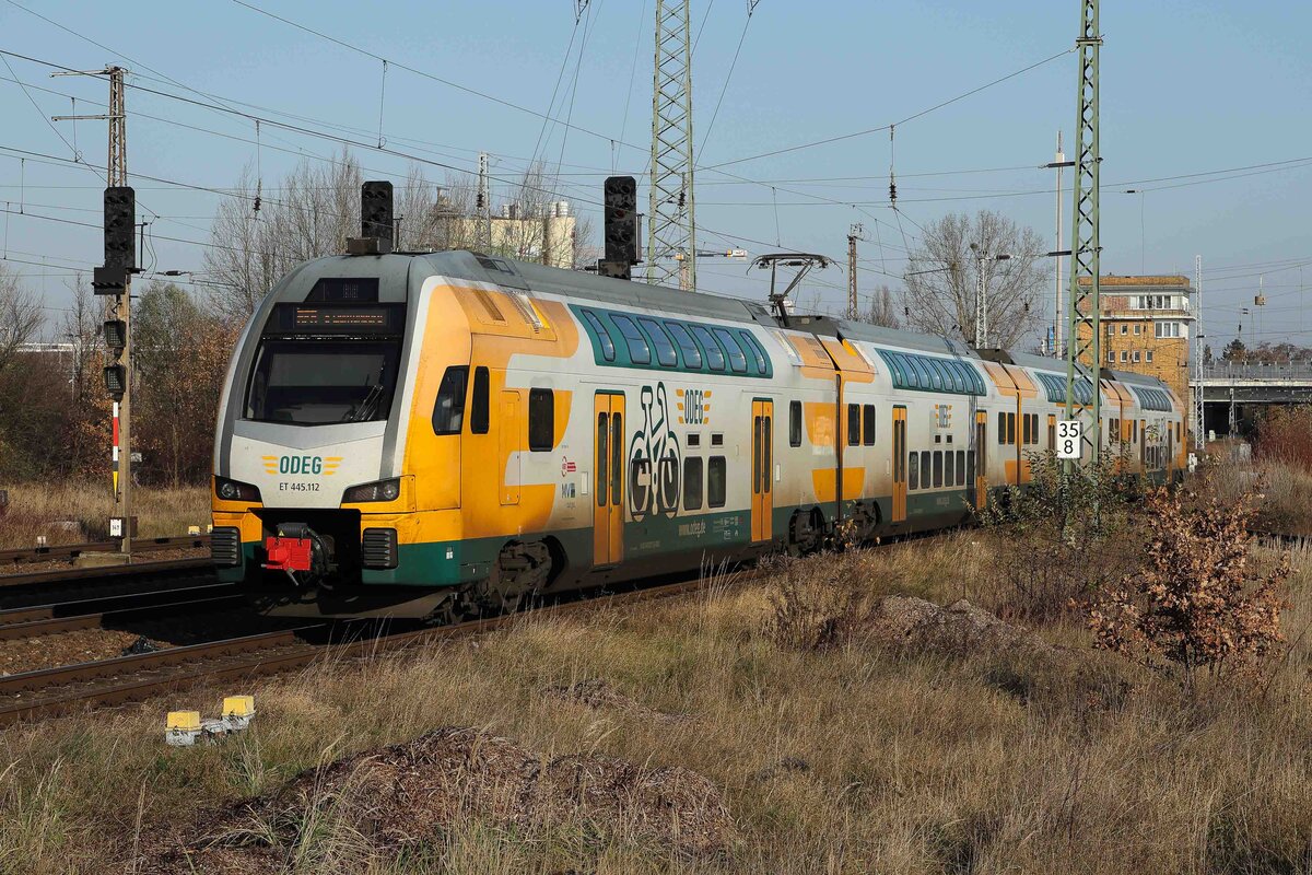 ODEG ET 445.100 hält aus Wittenberge kommend im Bahnhof Bad Wilsnack. Der Zug ist am 6.12.2024 um 14.10 Uhr als RE unterwegs nach Berlin Flughafen. Gerd Hahn