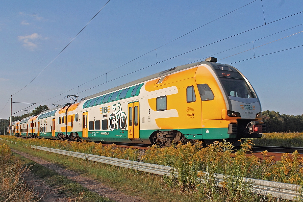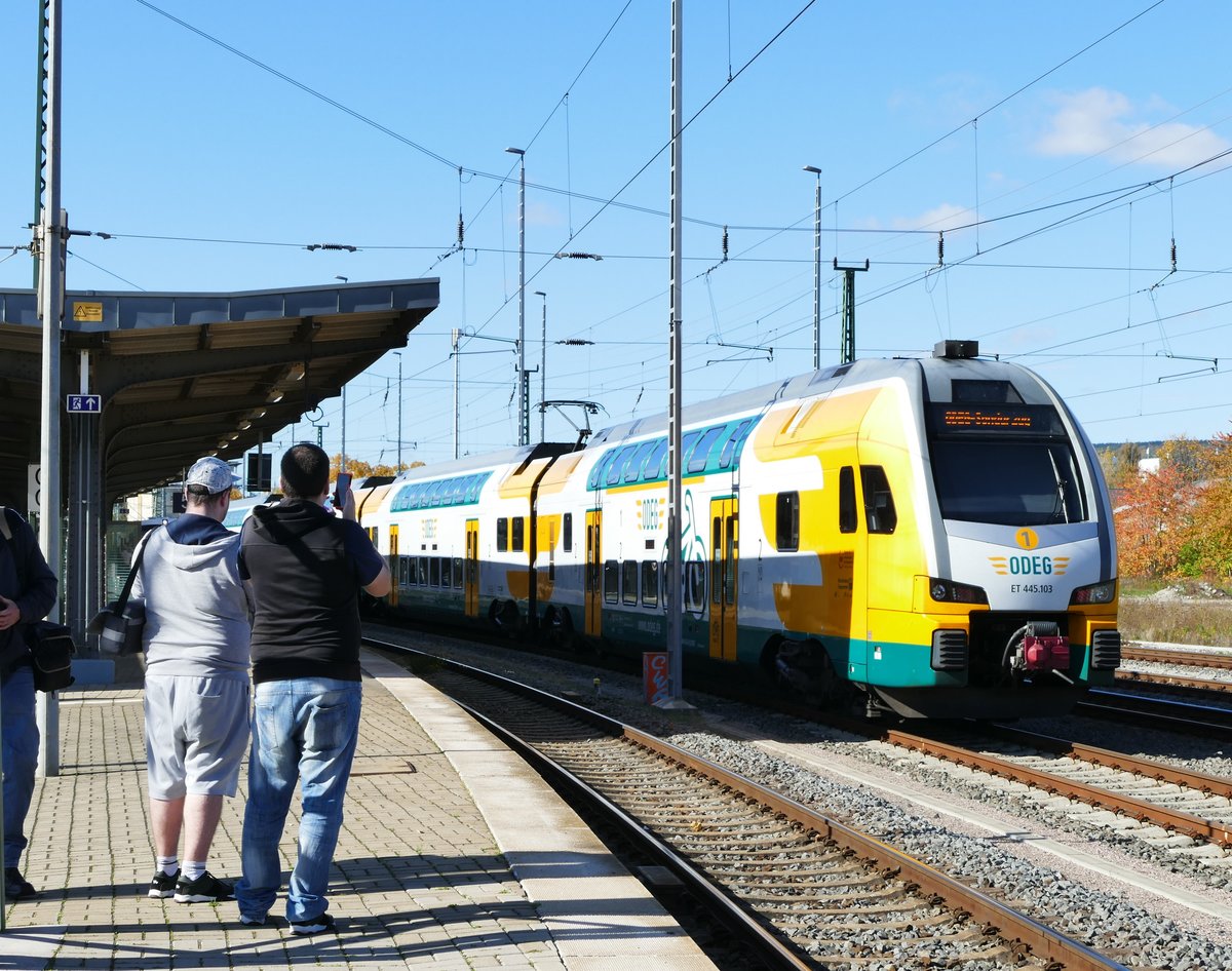 Am 12.10.19 war 445 111 als ODEG-Sonderfahrt von Berlin aus unterwegs zum Zwiebelmarkt nach Weimar. Hier durchfährt der KISS soeben Bitterfeld Richtung Halle(S). Martin Schneider
