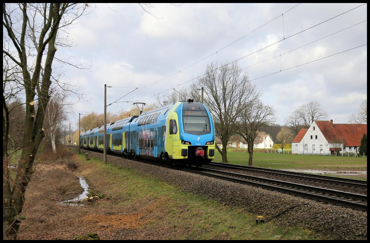 Ein Kiss von Stadler unter der Westfalenbahn betriebenen Firma fährt mit dem 5 teiligen Zug und dem Streiflicht der aufgehenden Sonne als RE 30 nach Rheine. Aufgenommen am 26.04.2019 Andreas Schreiber
