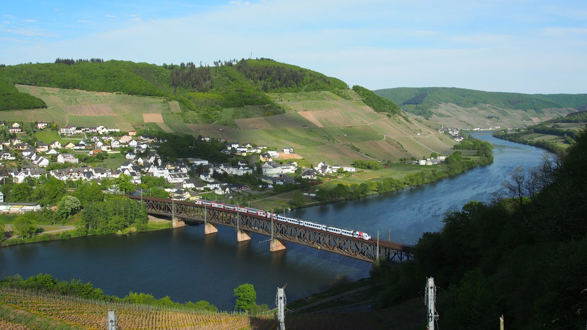 Aufgenommen unterhalb des Aussichtsturmes am Prinzenkopf befahren ein Flirt der DB (fährt voraus) und KISS der CFL als RE1 auf der Moselstrecke zwischen Trier und Koblenz die Doppelstockbrücke zu Bullay.