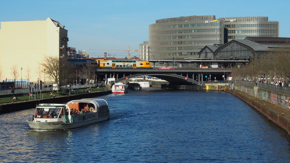 Ein RE2 der ODEG befährt die Berliner Stadtbahn, hier bei der Einfahrt in den Bahnhof B-Friedrichstraße. Auf der Spree war ob des guten Wetters reger Betrieb an dem Tag.