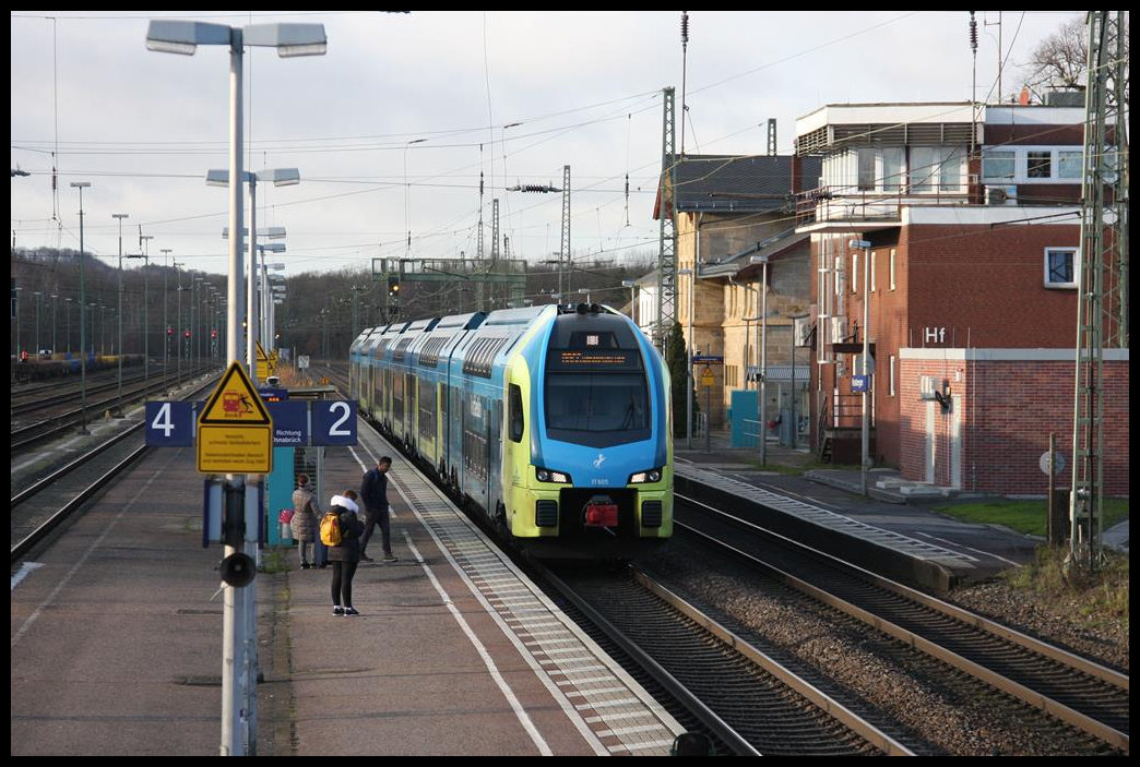 Um den Fahrzeugmangel auf der RB 66 zwischen Osnabrück und Münster zu kompensieren, mietete die Eurobahn zwei Kiss Triebwagen der Westfalenbahn an. Die erste Fahrt am 10.12.2018 machte der ET 605 der WFB, hier bei der Rückfahrt nach Osnabrück beim Halt im Bahnhof Hasbergen um 11.36 Uhr zu sehen. Gerd Hahn