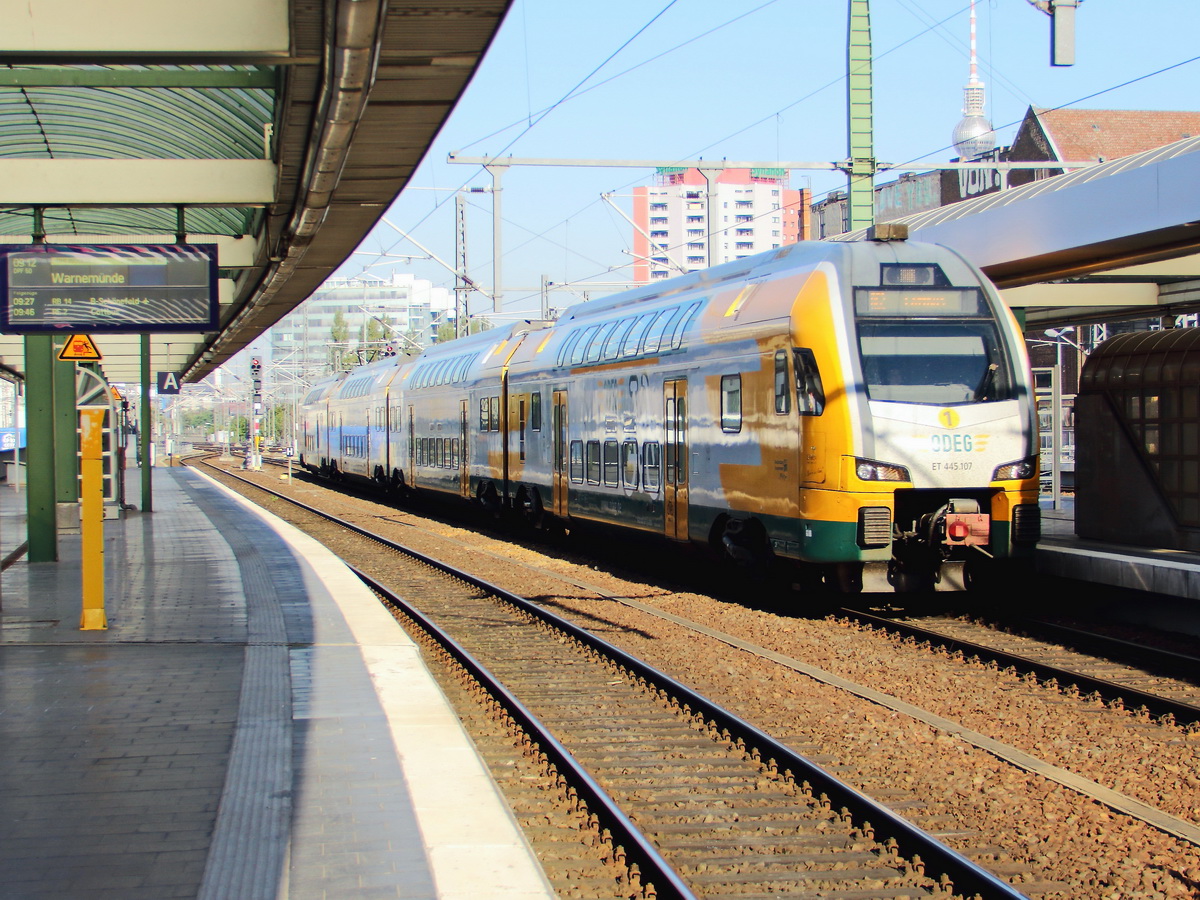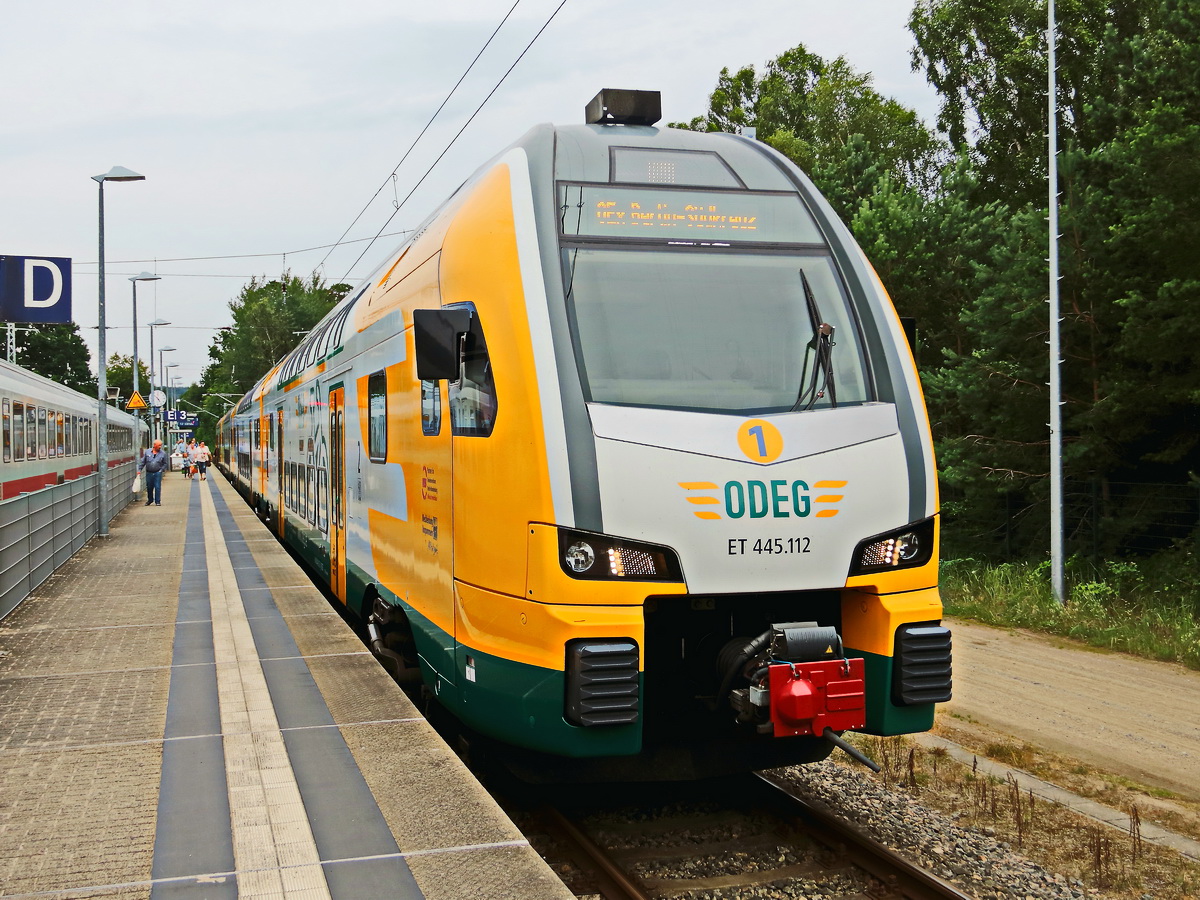 Im Bahnhof Binz (Binz Großbahnhof) steht am 22. Juli 2017 ET 445.112 (445 112-6) ODEG - Ostdeutsche Eisenbahn GmbH zur Rückfahrt nach Berlin Südkreuz bereit. Klaus-P. Dietrich