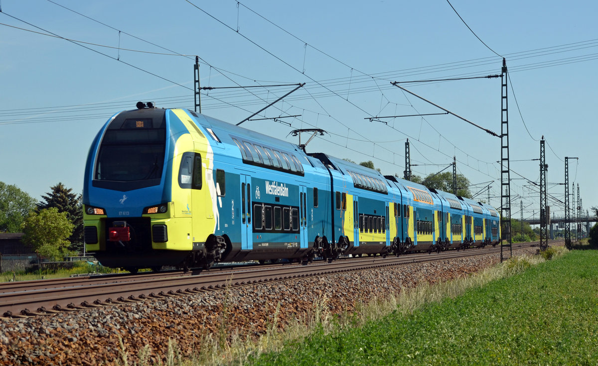 Für den Kirchentag wurden auch drei Kiss der Westfalenbahn nach Sachsen beordert. Hier fährt der ET 613(445 013) am 28.05.17 als Leerfahrt von Pratau nach Leipzig durch Gräfenhainichen. Martin Schneider
