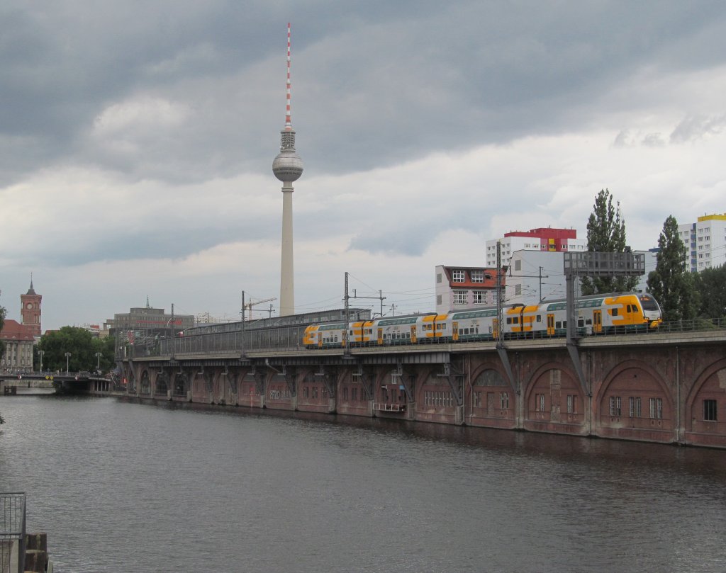 Hier links 402 042-6 "Quedlinburg" als ICE853 von Köln Hbf. nach Berlin Ostbahnhof mit 808 043-4 "Bautzen/Budy¨in" als ICE843 von Köln Hbf. nach Berlin Ostbahnhof und recht 445 111-8 als RE2 (RE37361) von Cottbus nach Berlin Hbf., diese beiden Triebzüge begegneten sich am 1.7.2013 in Berlin Hbf. Alexander