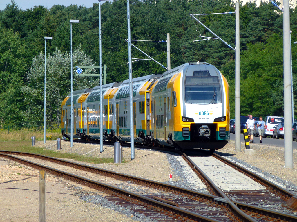 ET 445.111 (445 111-8) ODEG - Ostdeutsche Eisenbahn GmbH als RE2 (RE 37374) von Wismar nach Paulinenaue in Vietznitz. Aufgrund von Unwetterschäden am 06.08.2013, wurde die Bahnstrecke zwischen Berlin und Hamburg unterbrochen. Der Gleisabschnitt Paulinenaue–Nauen war bis zum Betriebsschluss unterbrochen gewesen. Eine Windhose hatte Bäume entwurzelt und diese hatten die Oberleitung beschädigt. Im Gleisabschnitt Paulinenaue–Wismar wurde im 2h-Takt gefahren. 06.08.2013 Stephan Kemnitz