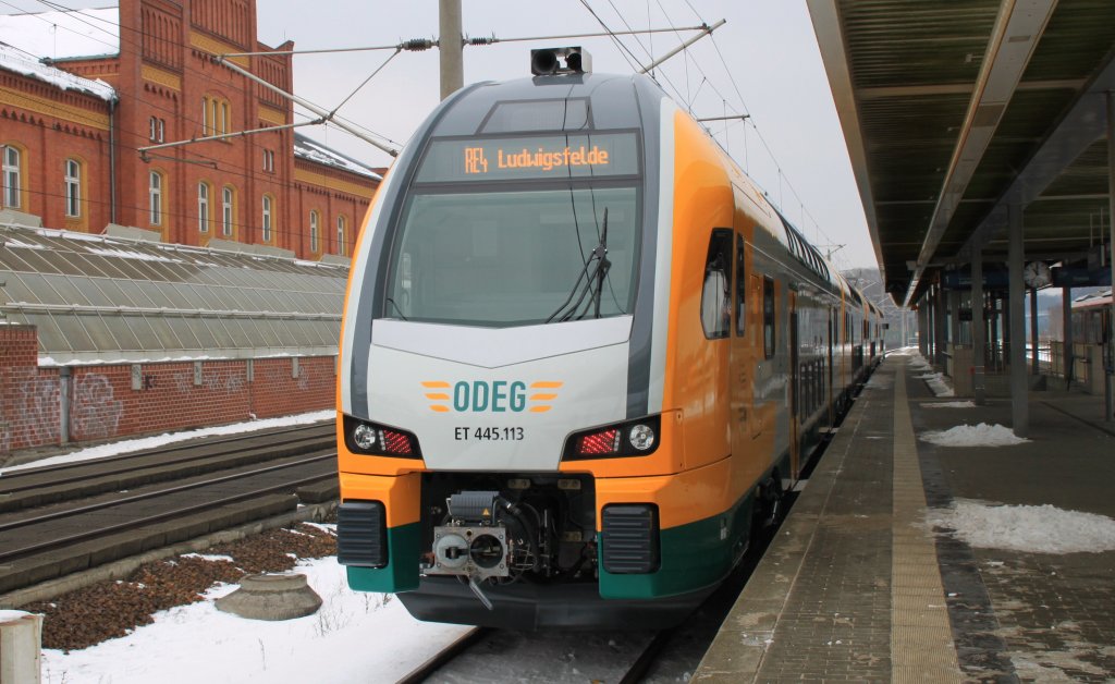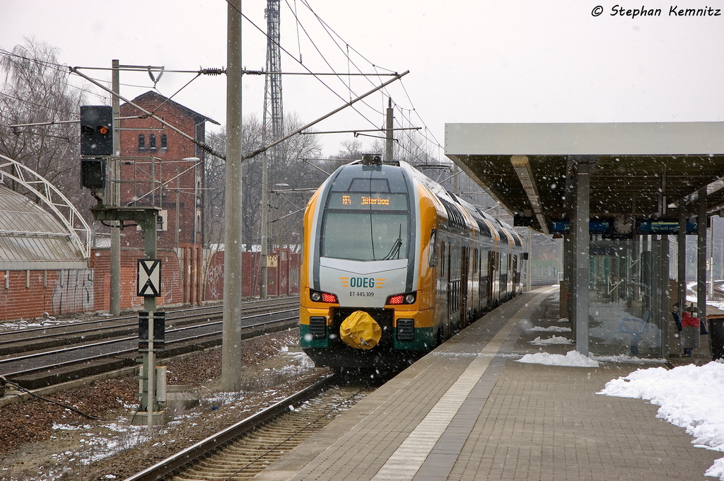ODEG KISS 445 109 steht am 09.02.2013 als 37308 im Bahnhof Ludwigsfelde zur Abfahrt, nach Rathenow, bereit, aus privaten Gründen hatte ich allerdings kurz RE2 nach Wittenberge geschildert Christian Trapp