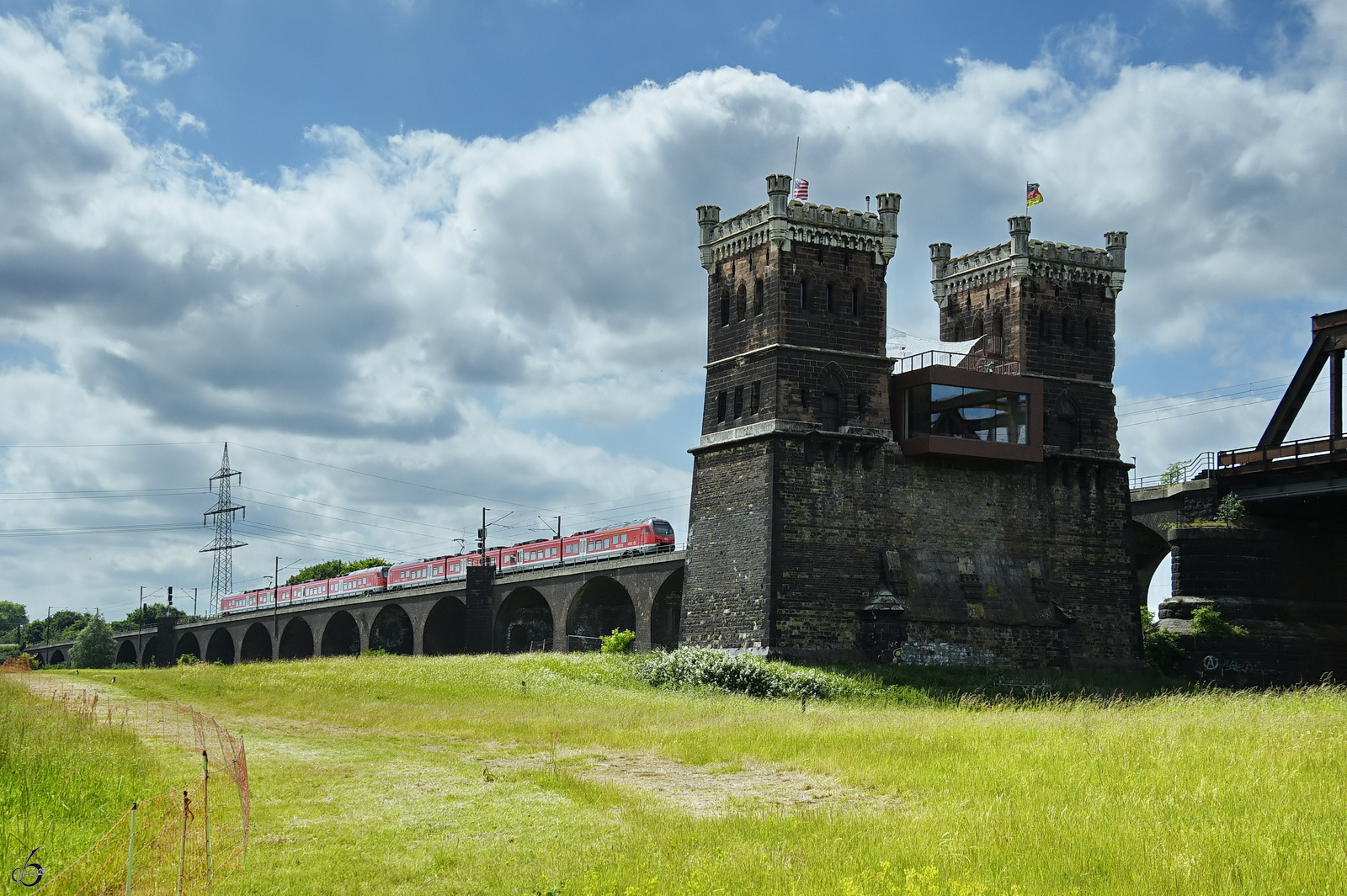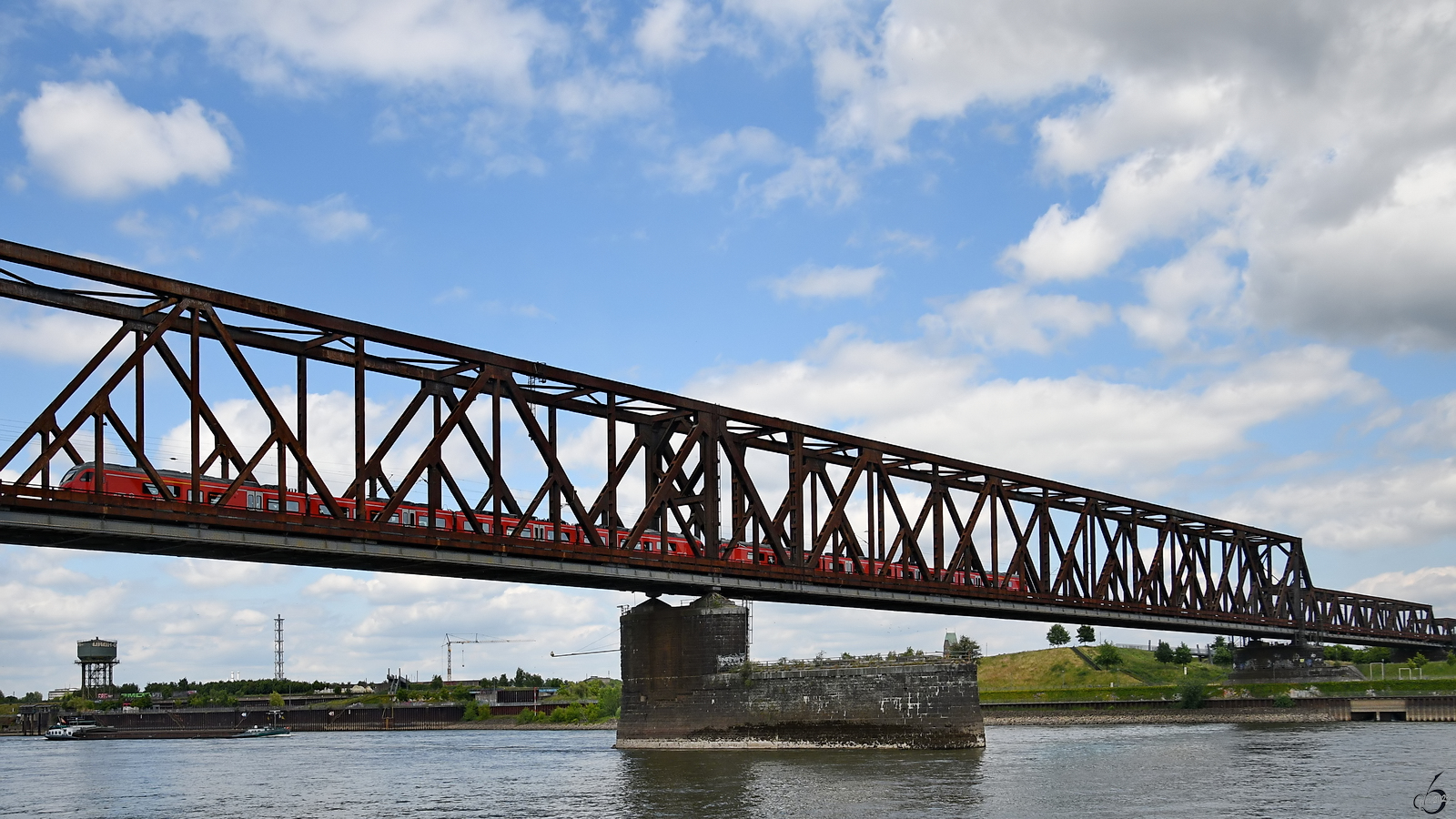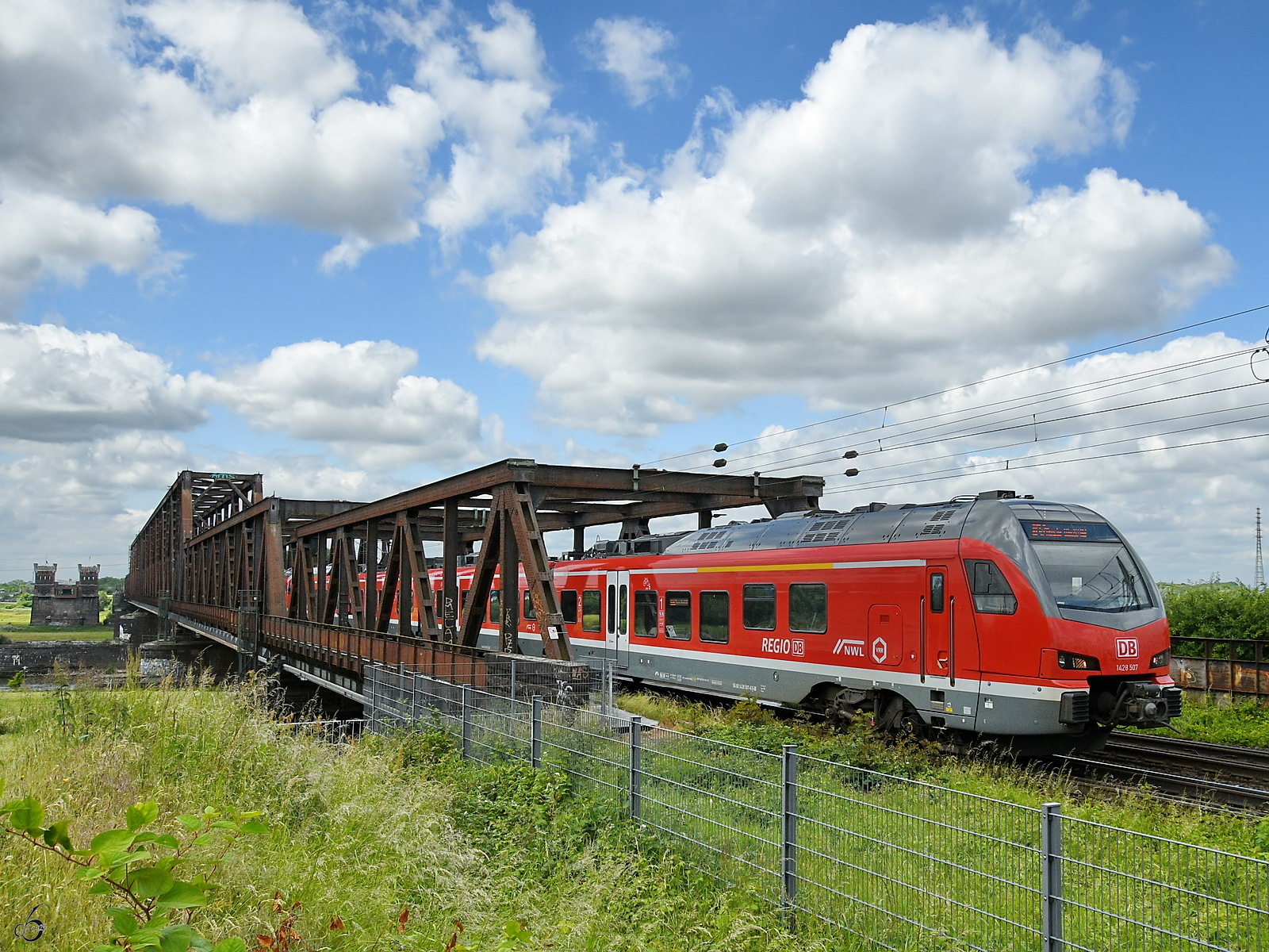 Die beiden aneinandergekoppelten DB-Elektrotriebzüge 1428 007 und 1428 008 sind hier Ende September 2025 auf der Duisburg-Hochfelder Eisenbahnbrücke zu sehen. Christian Bremer