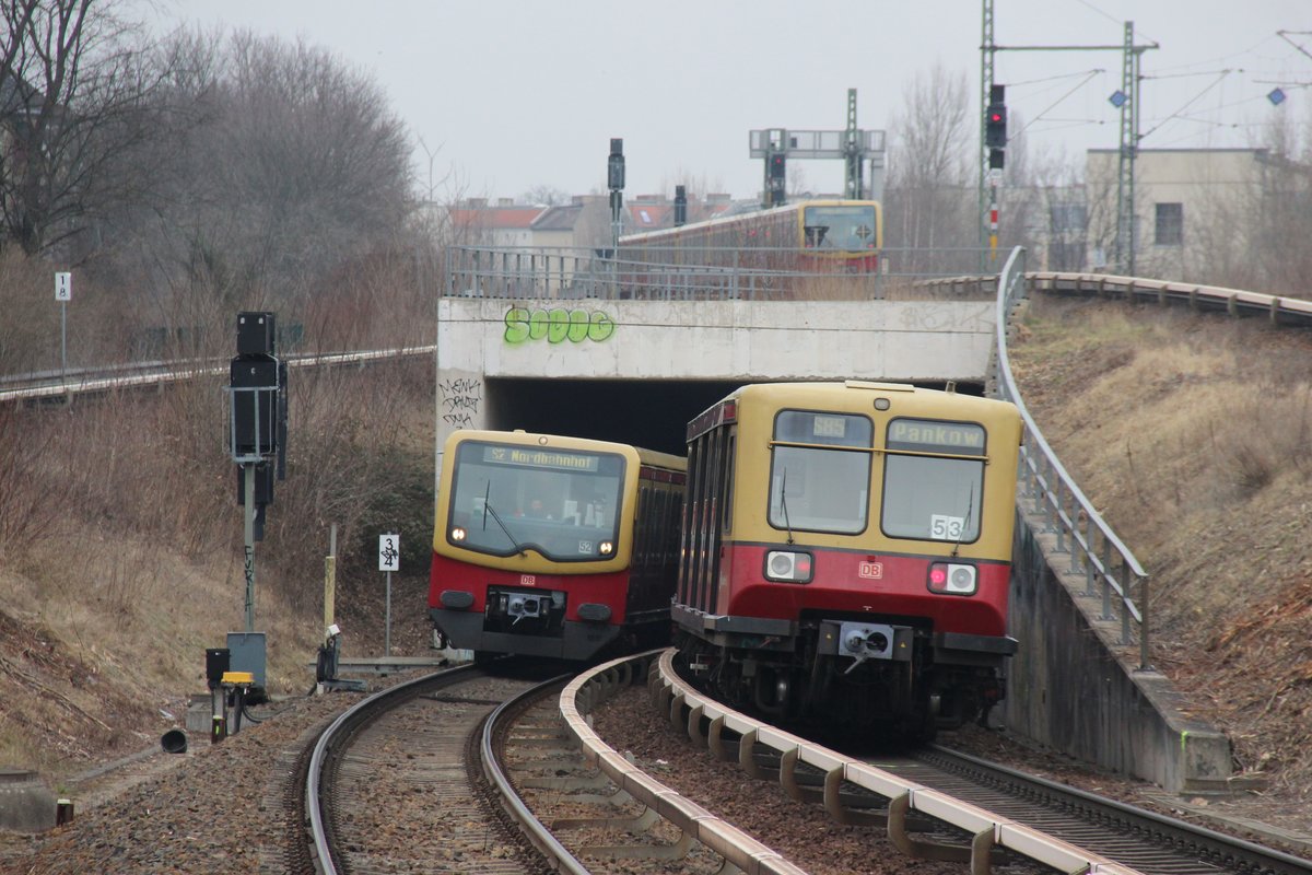 Die bislang jüngste Baureihe der S-Bahn Berlin der ET481 und die älteste noch im Betrieb befindliche Baureihe der ET485 auch liebevoll Coladose genannt begegneten sich am 23.3.18 an diesem geschichtsträchtigen Ort. Jens Hubers