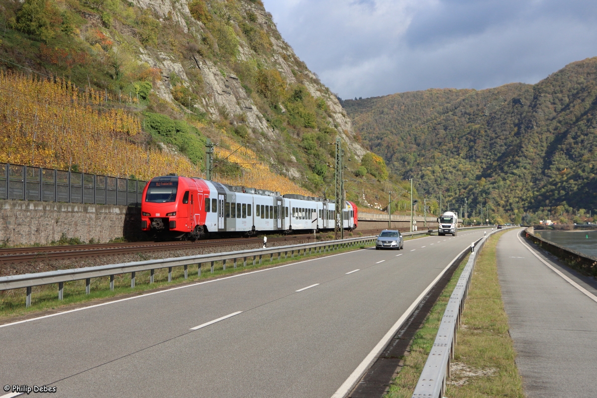 Der aus Luxemburg bzw. Mannheim kommende RE 11/RE 1, bestehend aus einem CFL-2300/DB-429-Doppel nähert sich am 23.10.2024 dem Bahnhof Treis-Karden, im Vordergrund der Ortsteil Treis Horst Lüdicke