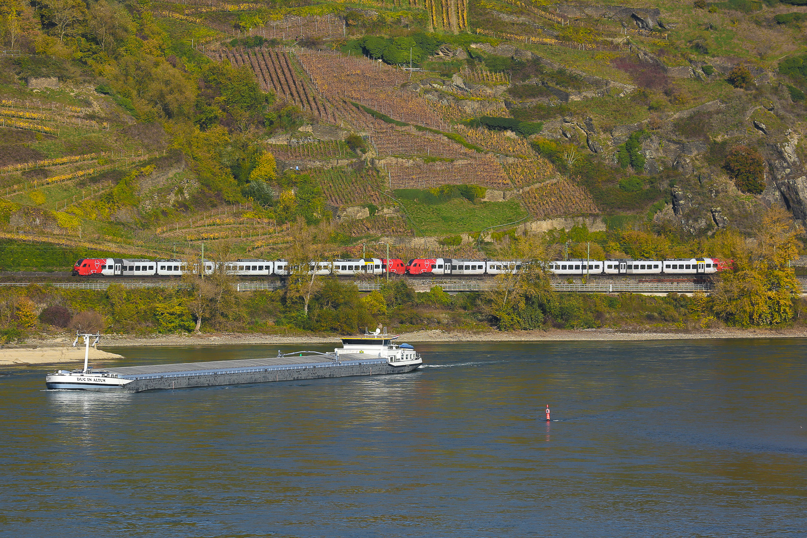 In den Weinbergen bei Treis: Am 23.10.2024 fahren ein 2300 der CFL und ein 429 der DB als RE 11/RE 1 von Luxemburg bzw. Mannheim am linken Moselufer in Richtung Koblenz Horst Lüdicke