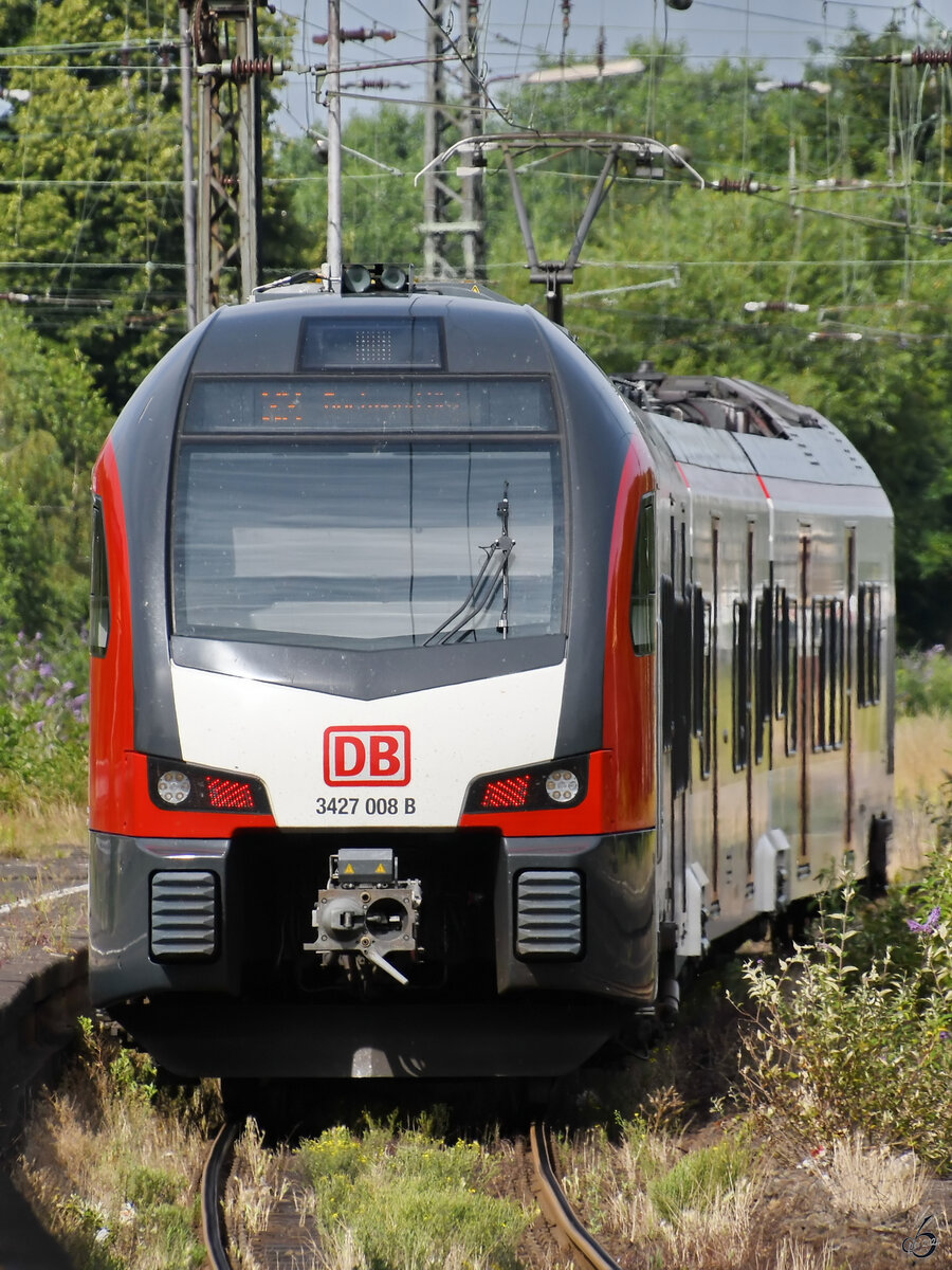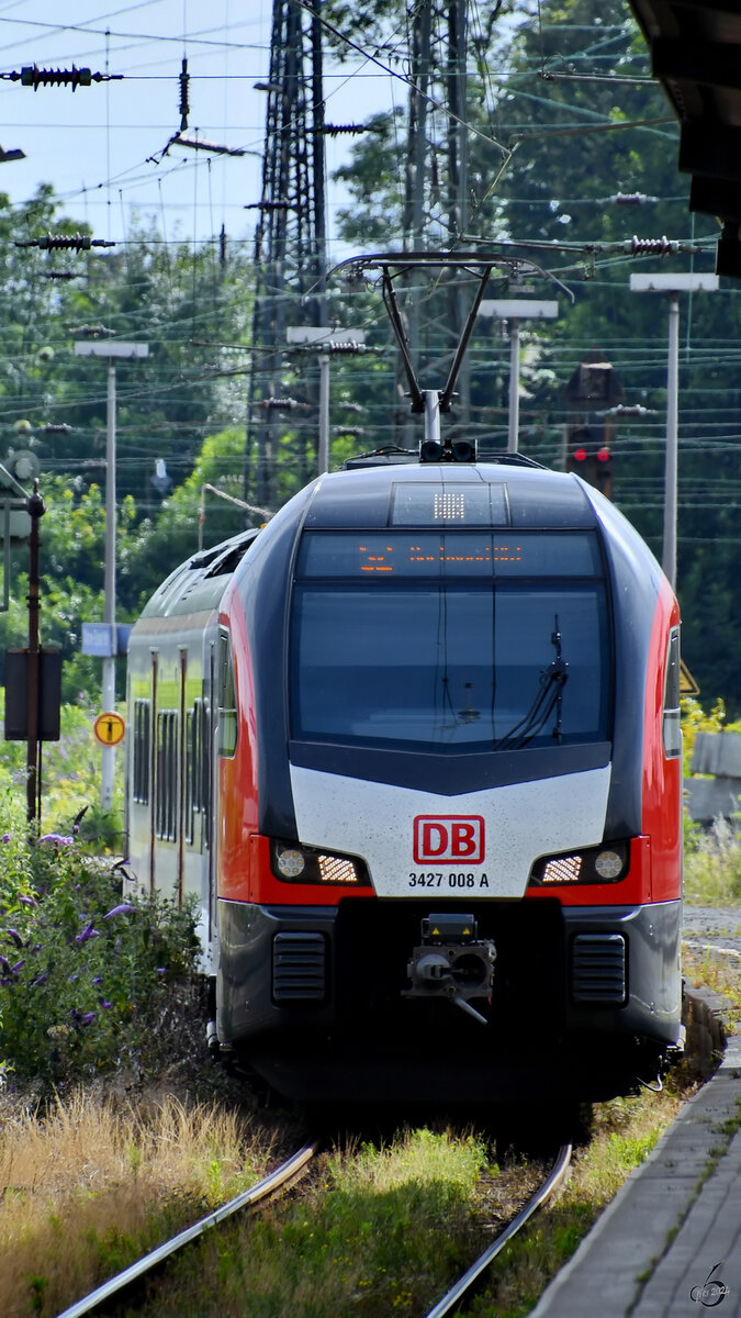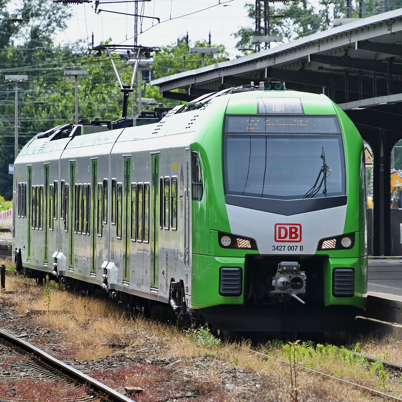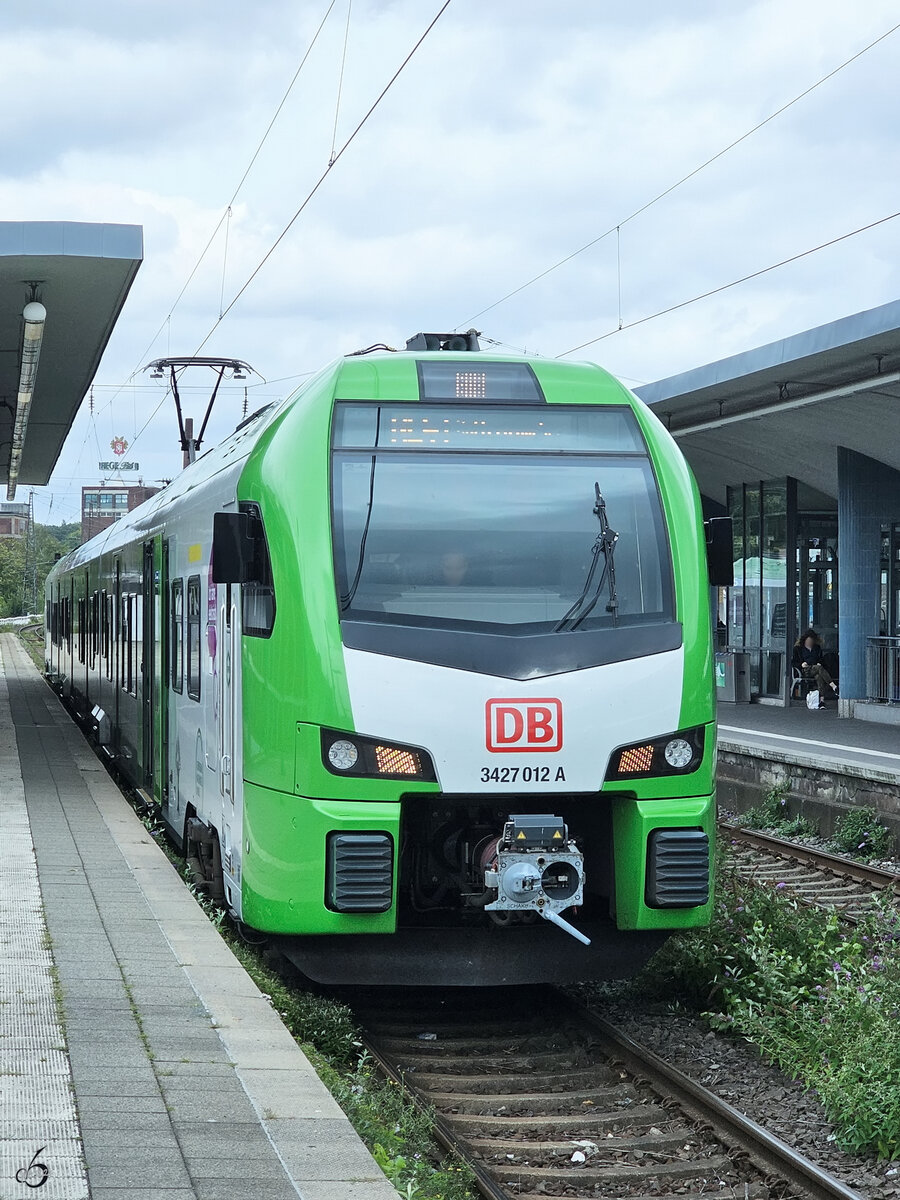 Der für die DB Regio AG – NRW fahrende dreiteilige Stadler FLIRT 3 XL 3427 014 (94 80 3427 014-0 D-STAP / 94 80 3827 014-6 D-STAP / 94 80 3427 514-9 D-STAP) der ZV VRR Eigenbetrieb Fahrzeuge und Infrastruktur, am 07 September 2024, als RE 34 „Dortmund-Siegerland-Express“, Umlauf 33088 (Dortmund Hbf - Letmathe - Siegen Hbf), rauscht von Kreuztal weiter in Richtung Siegen.