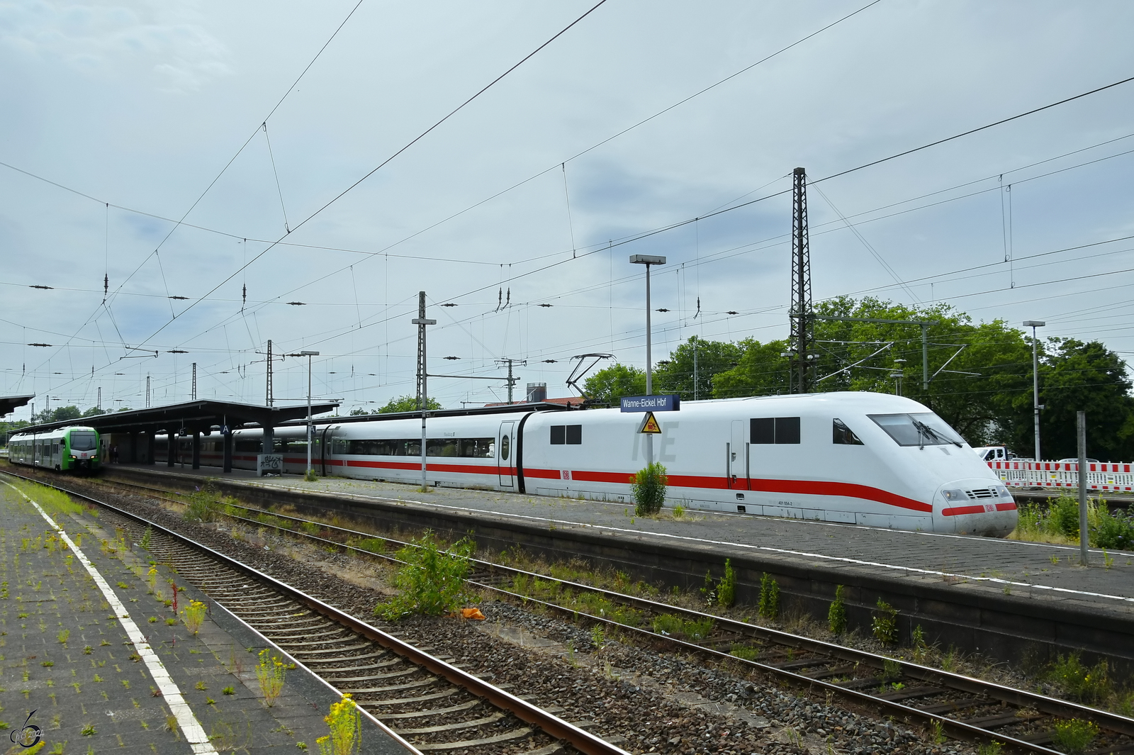 Die Triebzüge 401 054-2 "Flensburg" und 3427 005 warten auf die Weiterfahrt, so gesehen Ende Juni 2024 am Hauptbahnhof in Wanne-Eickel. Christian Bremer