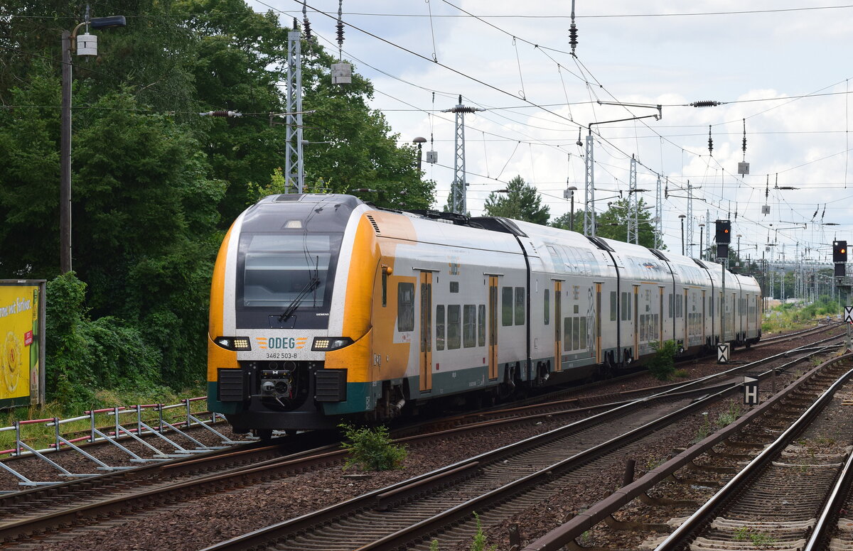 Ostdeutsche Eisenbahn GmbH, Parchim (ODEG) mit ihrem Desiro HC "3462 004-7" (NVR: "94 80 3462 004-7 D-ODEG.....") als RE1 nach Frankfurt (Oder) im Umleiterverkehr bei der Einfahrt Bahnhof Berlin Hohenschönhausen am 14.02.25 Lothar Stöckmann