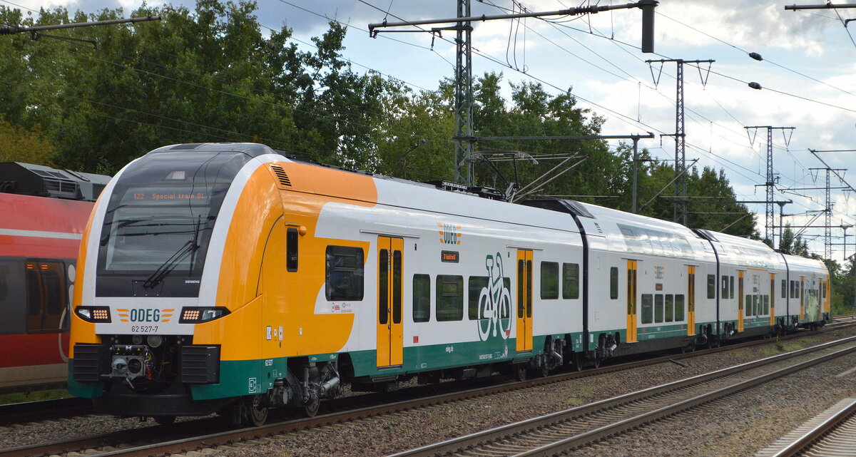 Hier eine vierteilige Version des Triebzuges Siemens Desiro HC für die ODEG, der Triebzug "62 527-7" (NVR: "94 80 3462 527-7 D-ODEG + 94 80 3862 627-1 D-ODEG + 94 80 3862 527-3 D-ODEG + 94 80 3462 127-6 D-ODEG") bei einer Testfahrt am 15.09.22 Durchfahrt Bahnhof Golm. Lothar Stöckmann