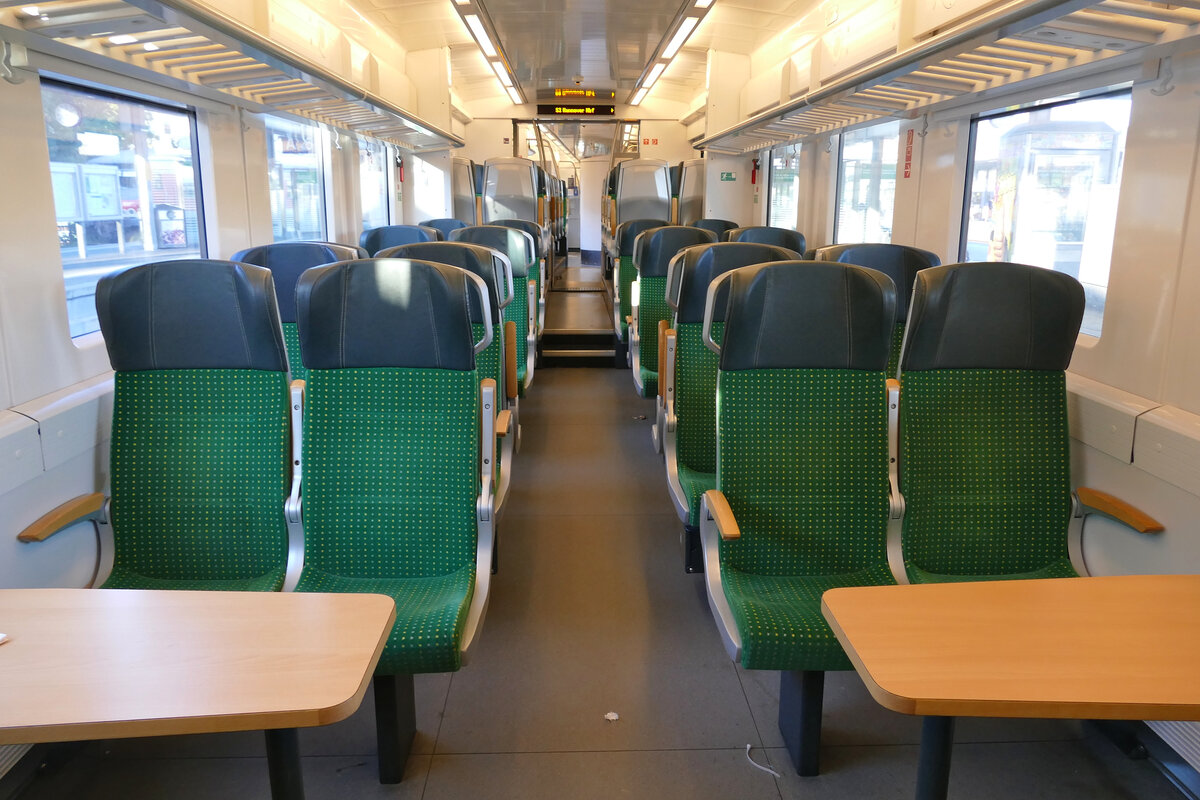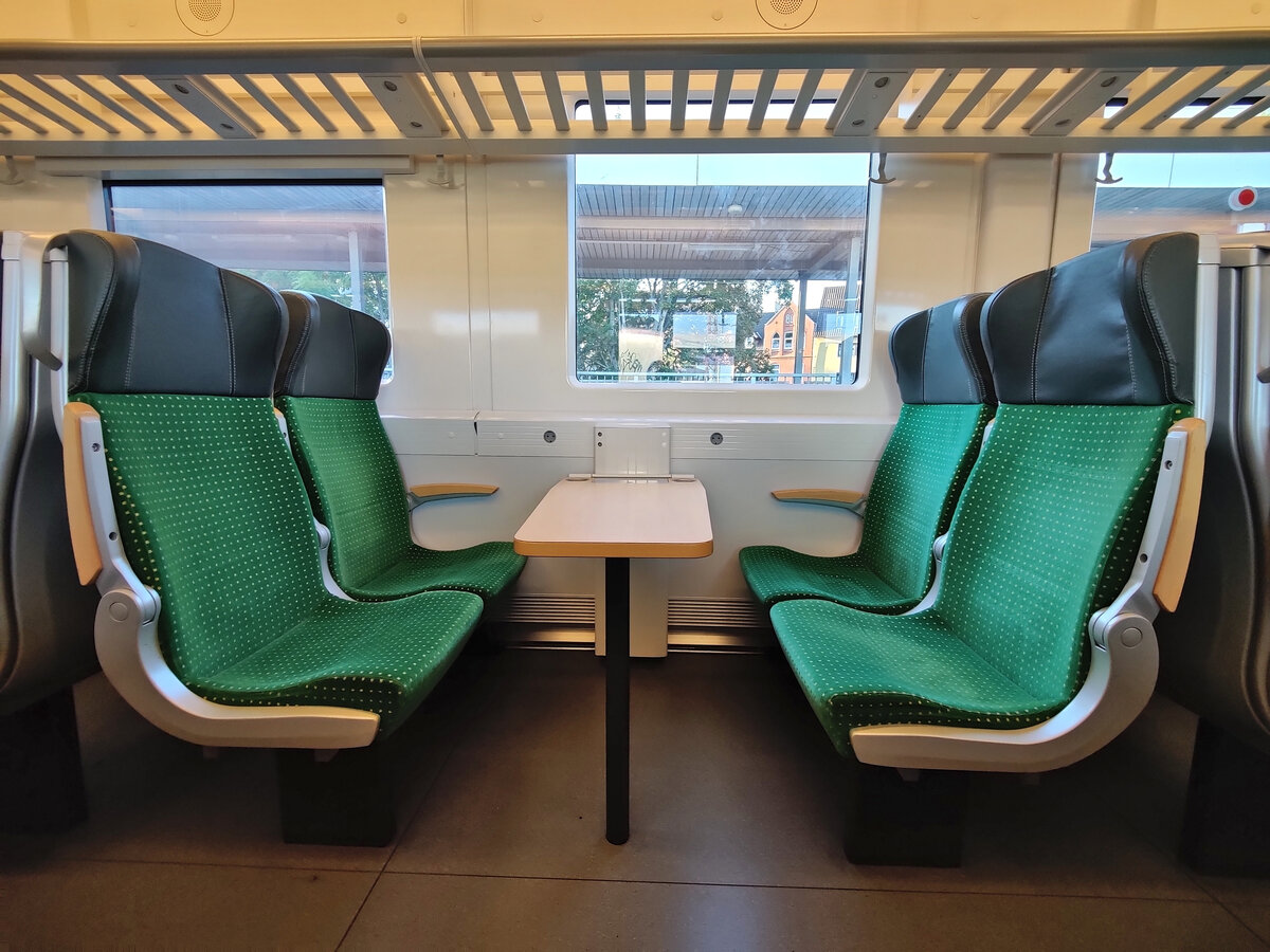 Ein Blick in das Interieur von 6442 913 (Bombardier Talent 3 Plus), mit Mehrzweckabteil und Vierer-Sitzgruppen. Diese haben im Unterschied zu Abellios Talent 2 keine Tische. Die Farben sind noch im bestellten ÖBB-Design gehalten.