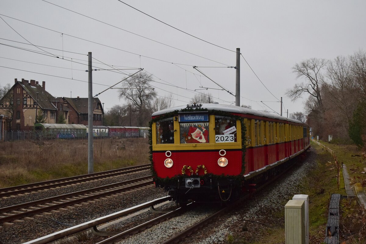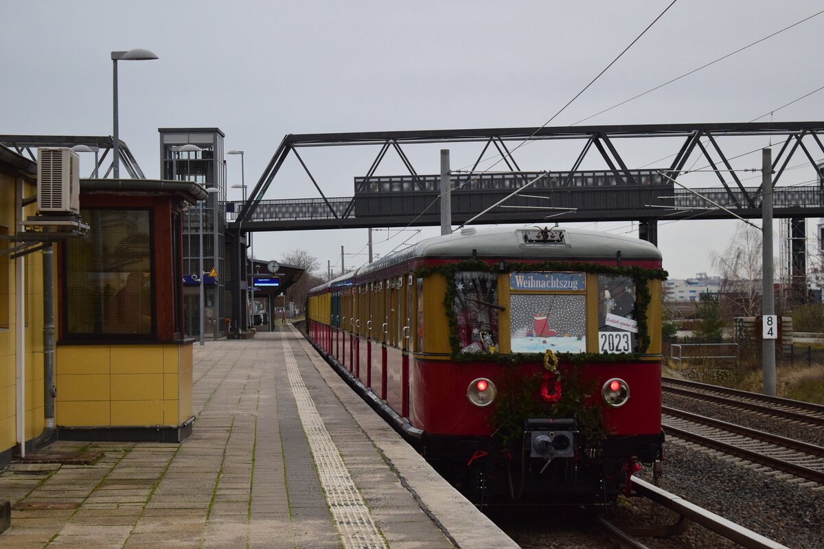 Nach 15 Jahren fuhr im Dezember 2023 der S-Bahn Weihnachtszug in Berlin wieder. Hier erreicht der Zug bestehdn aus dem Viertelzug 167 006 und 475 605 gleich Halensee.