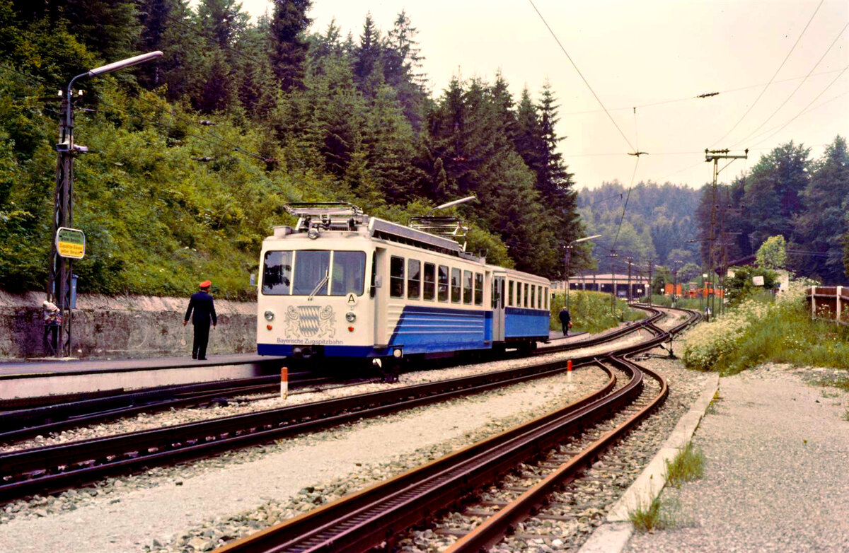 Zugbegegnung bei der Bayerischen Zugspitzbahn: Tallokomotive 2 und ein Zahnradtriebwagen (BZB 5-6) am Bahnhof Grainau, dem Betriebsmittelpunkt der Bahn (Sommer 1984) Frank Nowotny