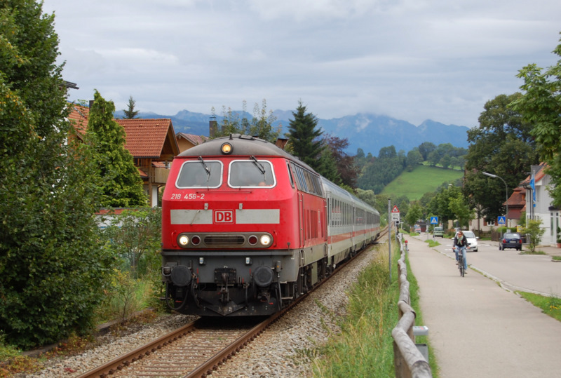 Zurück am "Oberstdorfer Bähnle" (I): Nach etwa einem Jahr zog es mich am 7.8.2011 wieder an eine meiner Lieblingsfotostellen an der Bahnstrecke Immenstadt - Oberstdorf. Dieses Jahr bot sich auch endlich mal die Gelegenheit, die Stelle mit einer 218 umzusetzen, da aufgrund der Streckensperrung im Abschnitt Altstädten - Oberstdorf die IC "nach Gebrauch" als Lr nach Kempten gefahren wurden. Die Ulmer 218 456-2 zieht ihren Lr 78892, der aus dem Wagenpark des IC 2085 besteht, in den Bahnhof Immenstadt, wo die Lok umsetzen wird, um anschließend zur Nachtruhe zu fahren. Ein freundlicher Gruß geht an den Tf der Fuhre. Pascal Ost