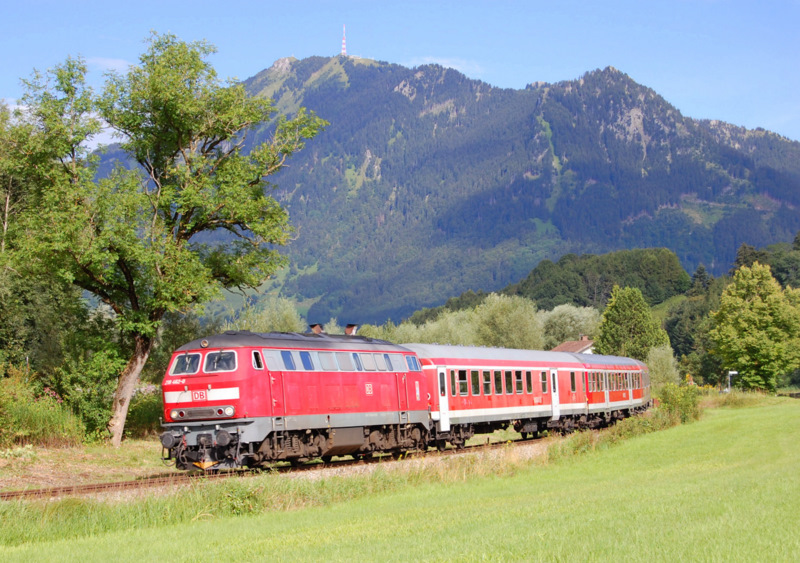 Zurück am "Oberstdorfer Bähnle" (III): Vor der Kulisse des Grüntens - auch "Wächter des Allgäus" genannt - durchfährt 218 434-9 der Ulmer RAB eine Rechtskurve, um den Bahnhof Immenstadt anzustreben. Die Aufnahme des zu sehenden Lr 78892 (Sonthofen - Kempten) datiert vom 11.8.2011. (farblich nachbearbeitete Version) Pascal Ost