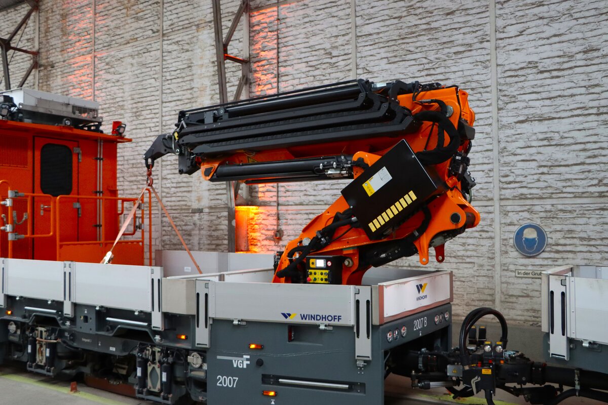 Kran am VGF Windhoff Gleisarbeitszug mit Schienentransportwagen in der Mitte am 21.09.25 beim Tag der Schiene im Betriebshof Eckenheim am Abend. Hier handelt es sich um die VGF Wagen 2007 Daniel Oster