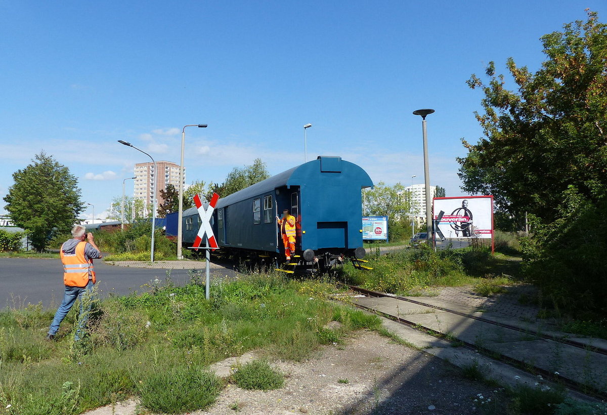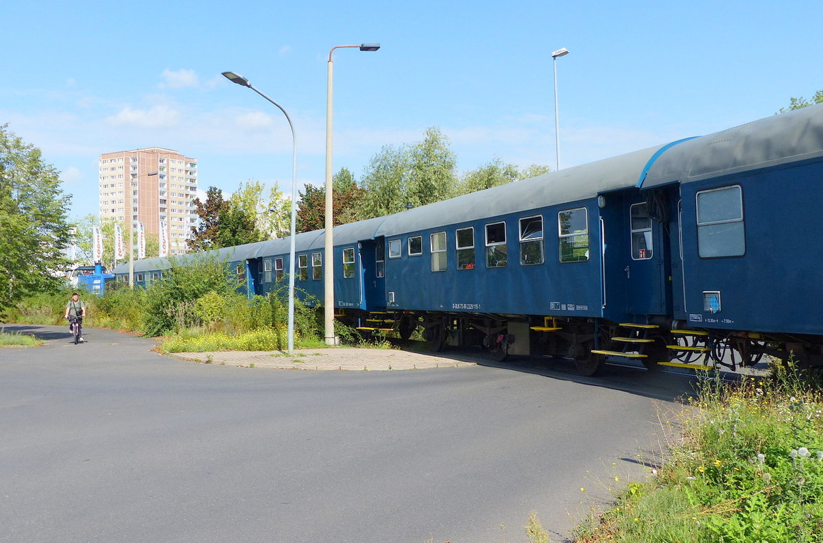 Wagen des Theaterzuges "Das letzte Kleinod" (75 80 2329 182-9 D-DLK), abgestellt anlässlich der Aufführung "Über den Zaun" im frei zugänglichen Hafen Magdeburg.