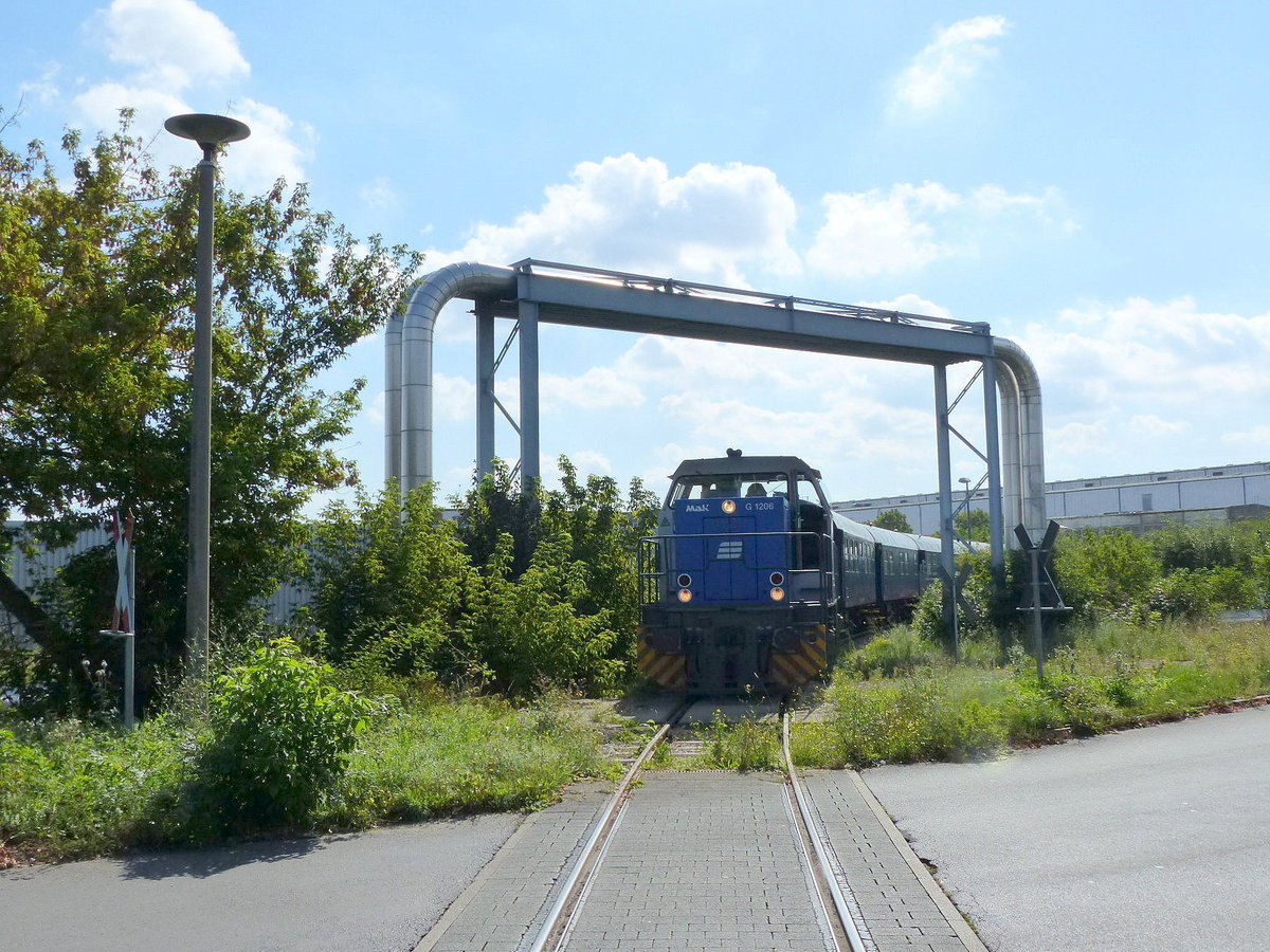 hvle "V160.5" (NVR: 92 80 1203 143-3 D-HVLE) mit dem interessanten Theaterzug "Das letzte Kleinod" mit den alten dreiachsigen Bahndienstwagen + gedecktem altem Güterwagen + Flachwagen mit Baucontainern und Maschinen am 27.08.20 Bf. Saarmund. Inwieweit der Zug zu Coronazeiten bzw. überhaupt noch genutzt wird ist mir nicht bekannt. Lothar Stöckmann
