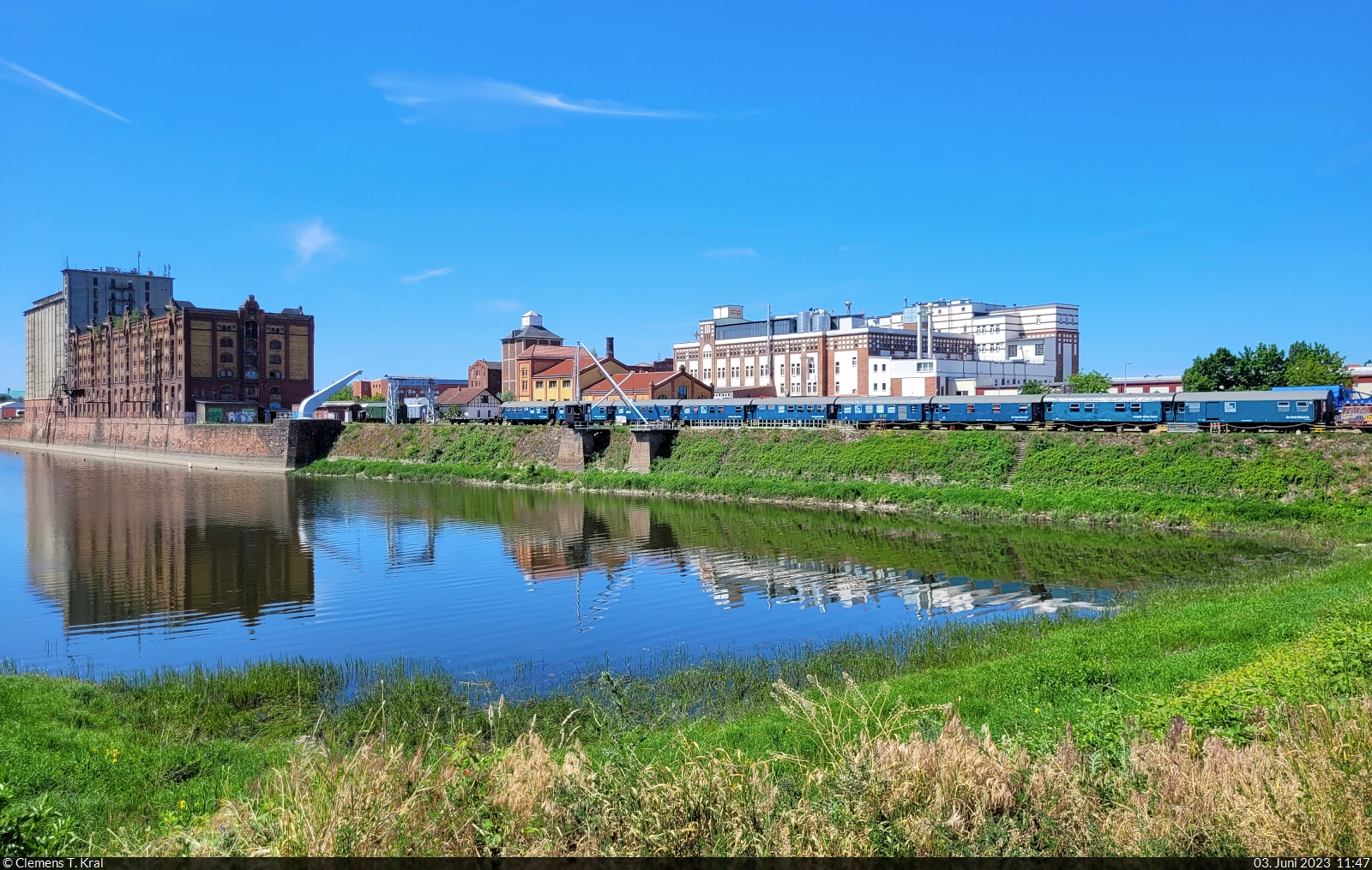Der Theaterzug "Das letzte Kleinod" kam in den Hafen Magdeburg. Bei einer Radtour durch die Elbestadt wurde das unverkennbare ozeanblaue Gespann zufällig entdeckt und nicht schlecht gestaunt.
