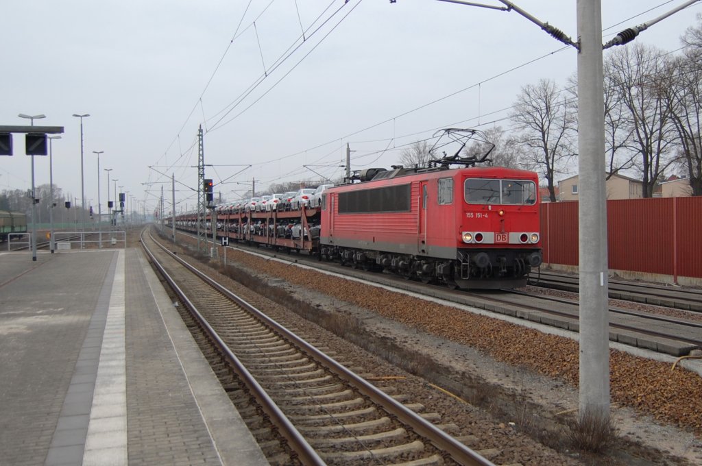 155 151-4 zieht einen mit Toyota´s beladen Autotransporter in Richtung Wustermark 17.03.2010