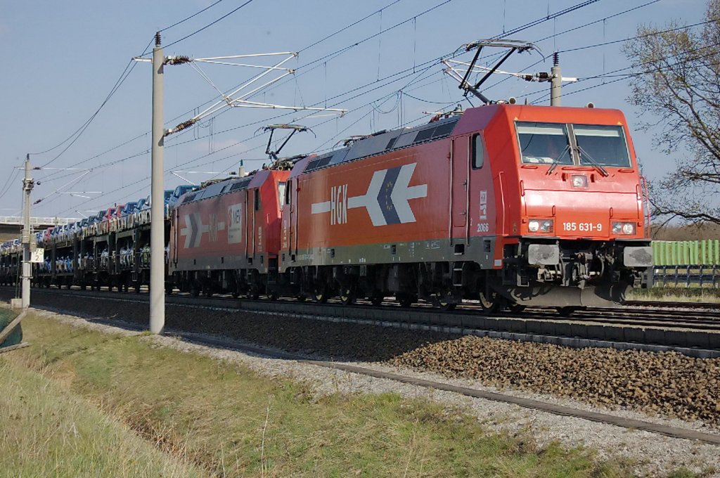 185 631-9 (HGK 2066) & 185 587-3 (HGK 2055) ziehen zusammen in Doppeltraktion einen Ford Autotransportzug zwischen Großwudicke und Rathenow in Richtung Stendal. 24.04.2010
