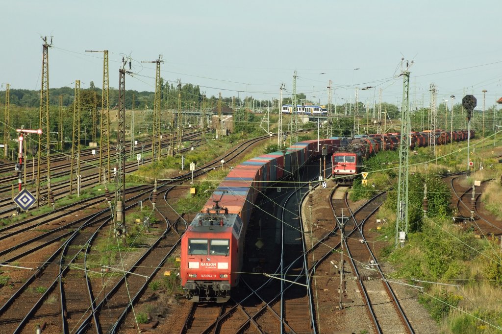 Während im Hintergrund ein HEX aus Bernburg nach Halle Hbf einfahren will, schleichen sich 145 054 und 155 220 mit ihrem Anhang zum Rangierbahnhof.