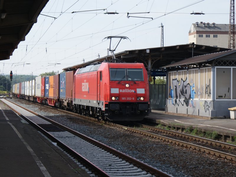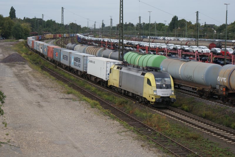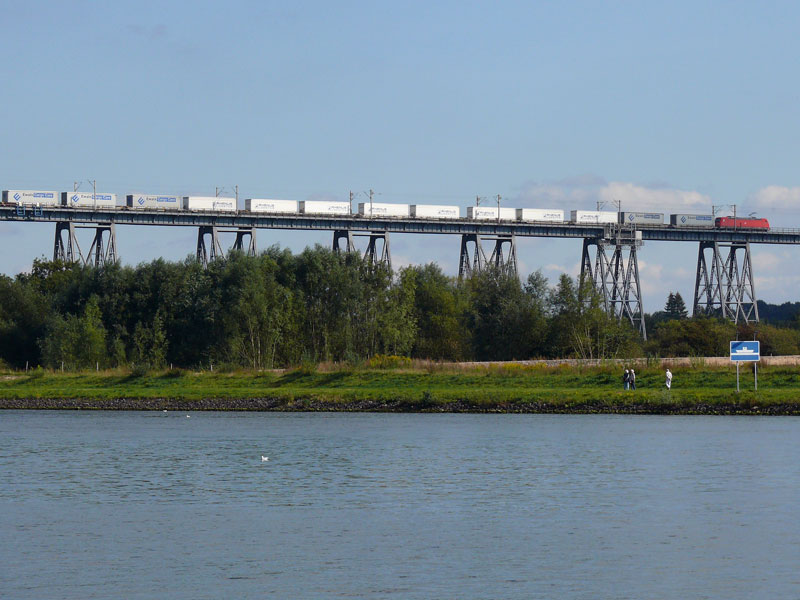 Ein Containerzug hat aus Richtung Flensburg kommend die Hochbrücke über den Nord-Ostsee-Kanal passiert. Zuglok ist wahrscheinlich eine BR 185; Rendsburg, 16.09.2009
