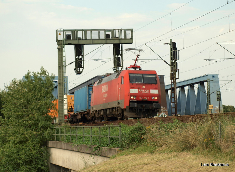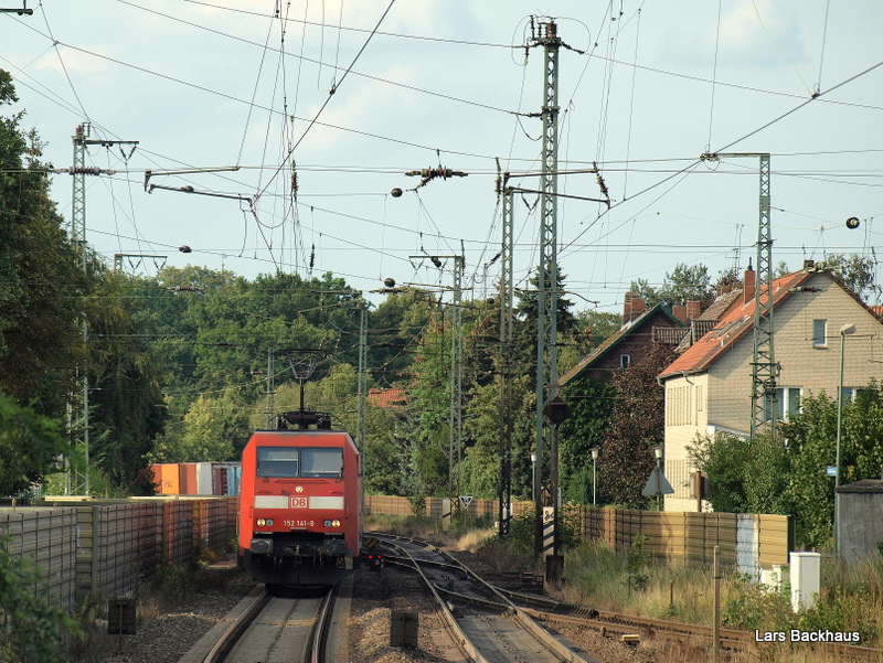 152 141-8 poltert am 16.08.09 mit einem Containerzug aus Hamburg-Waltershof Richtung Süden. Aufgenommen kurz vor der Durchfahrt in Lüneburg. Lars Backhaus