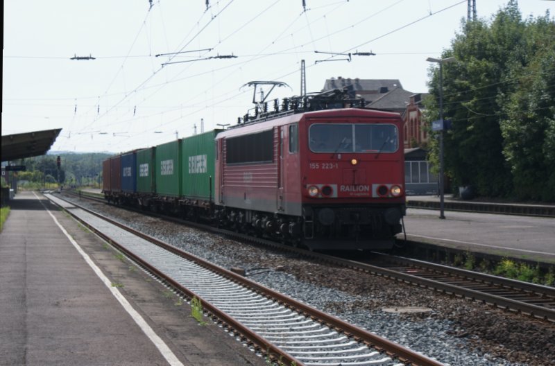 152 127-7 durchfährt am 16.08.09 mit einem Containerzug den Bahnhof Lüneburg Richtung Süden. In wenigen Minuten werden die ME's nach Uelzen und Hamburg Hbf eintreffen, daher auch die recht vollen Bahnsteige. Lars Backhaus