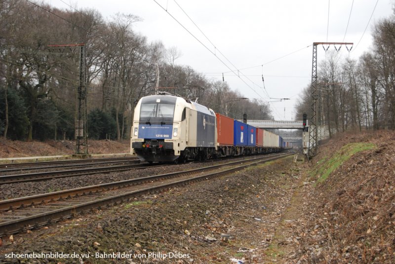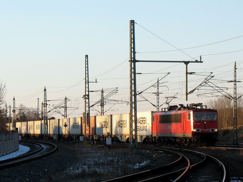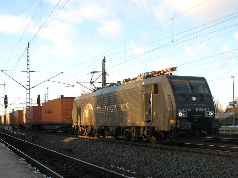 Im Licht (und Schatten) des späten Nachmittags kommt ES64 F4-011 (E 189 911) von CTL LOGISTICS mit einem Containerzug von Hamburg durch Büchen; 12.02.2009
