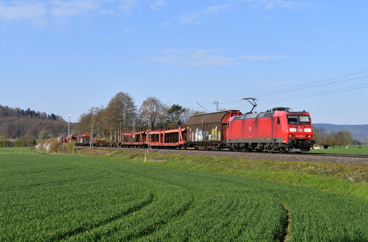 DB Cargo AG, Mainz mit ihrer "187 195" [NVR-Nummer: 91 80 6187 195-3 D-DB] und einem gemischten Güterzug am 09.10.24 Höhe Bahnhof Schönefeld b. Berlin.