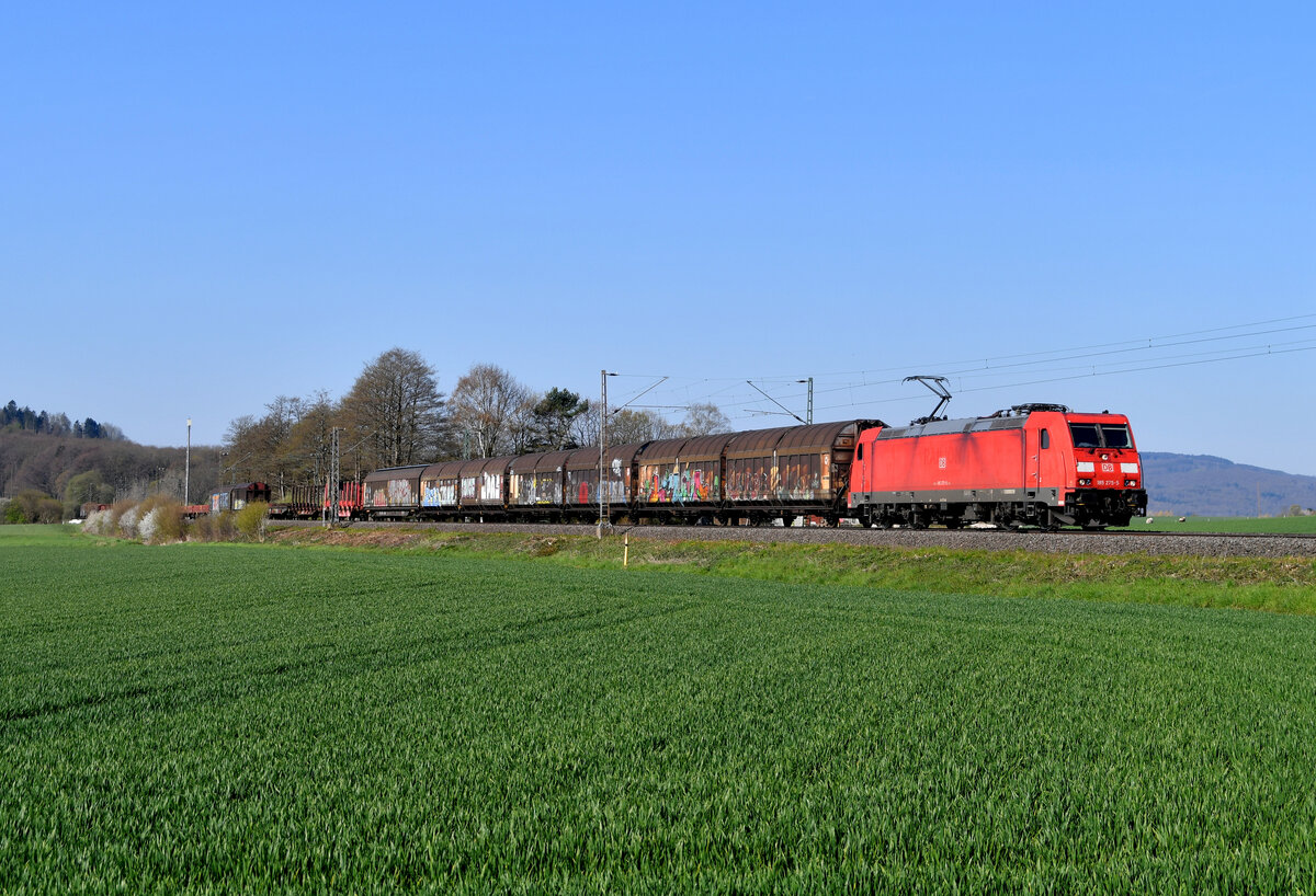DB-Cargo 91 80 6187 117 befördert im Abendlicht des 08.04.2024 einen gemischten Güterzug durch Bochum-Langendreer.