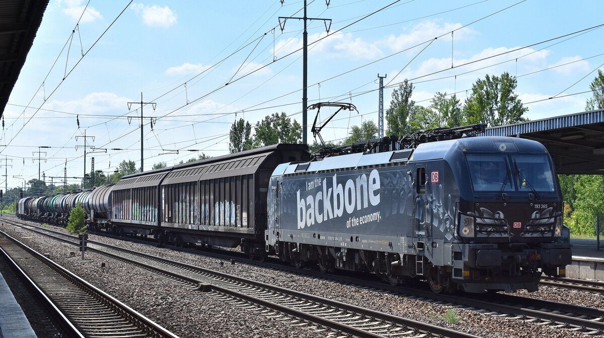 DB Cargo AG, Mainz mit ihrer  193 365  [NVR-Nummer: 91 80 6193 365-4 D-DB] und einem gemischten Güterzug am 01.08.24 Höhe Bahnhof Schönefeld b. Berlin.