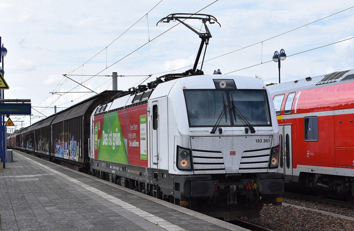 DB Cargo AG, Mainz mit ihrer  193 361  [NVR-Nummer: 91 80 6193 361-3 D-DB] und einem gemischten Güterzug am 24.07.24 Durchfahrt Bahnhof Lübben (Spreewald).