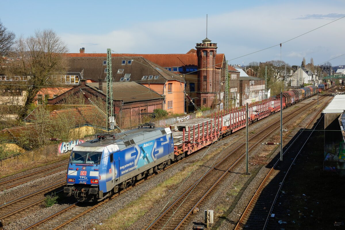 DB Cargo AG, Mainz mit ihrer "152 006-3" (NVR: "91 80 6152 006-3 D-DB") und einem gemischten Güterzug Richtung Frankfurt/Oder weiter am 26.03.24 Höhe Bahnhof Berlin-Hirschgarten.